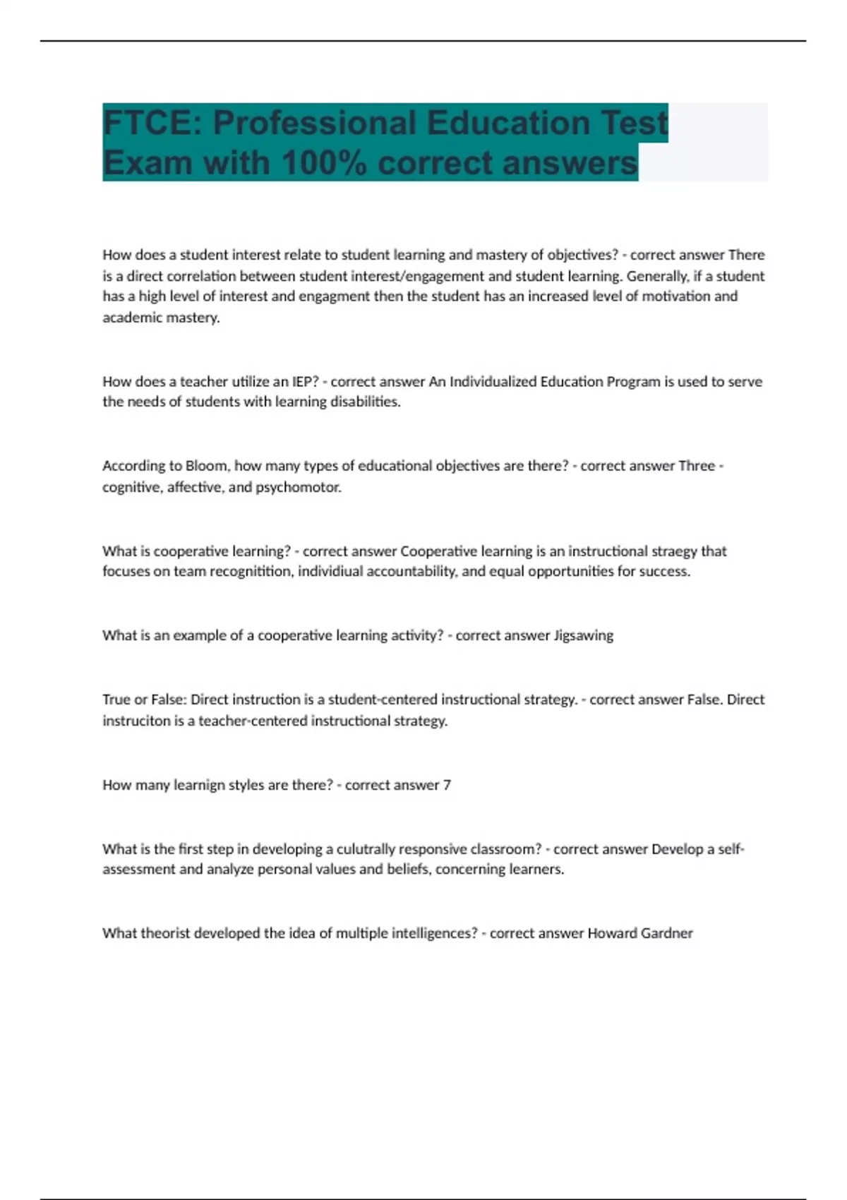 How does a student interest relate to student learning and mastery of objectives? - correct answer There is a direct correlation between student interest/engagement and student learning. Generally, if a student has a high level of interest and engagment then the student has an increased level of motivation and academic mastery. How does a teacher utilize an IEP? - correct answer An Individualized Education Program is used to serve the needs of students with learning disabilities. According to Bloom, how many types of educational objectives are there? - correct answer Three - cognitive, affective, and psychomotor. What is cooperative learning? - correct answer Cooperative learning is an instructional straegy that focuses on team recognitition, individiual accountability, and equal opportunities for success. What is an example of a cooperative learning activity? - correct answer Jigsawing True or False: Direct instruction is a student-centered instructional strategy. - correct answer False. Direct instruciton is a teacher-centered instructional strategy. How many learnign styles are there? - correct answer 7 What is the first step in developing a culutrally responsive classroom? - correct answer Develop a self-assessment and analyze personal values and beliefs, concerning learners. What theorist developed the idea of multiple intelligences? - correct answer Howard Gardner In what stage of Piaget's cognitive development would a learner be equipped to think logically about abstract ideas? - correct answer Formal operational stage (adolescence to adulthood) How does Bloom's taxonomy relate to higher-level thinkiong? - correct answer The levels at the top of the taxonomy (analyzing, creating, evalutationg) generally reflect higher-order thinking skills developed by students. What is the primary difference between deductive and inductive thinking? - correct answer Deductive thinking strates with one or two general statements and leads to a specific conclusion, while inductive