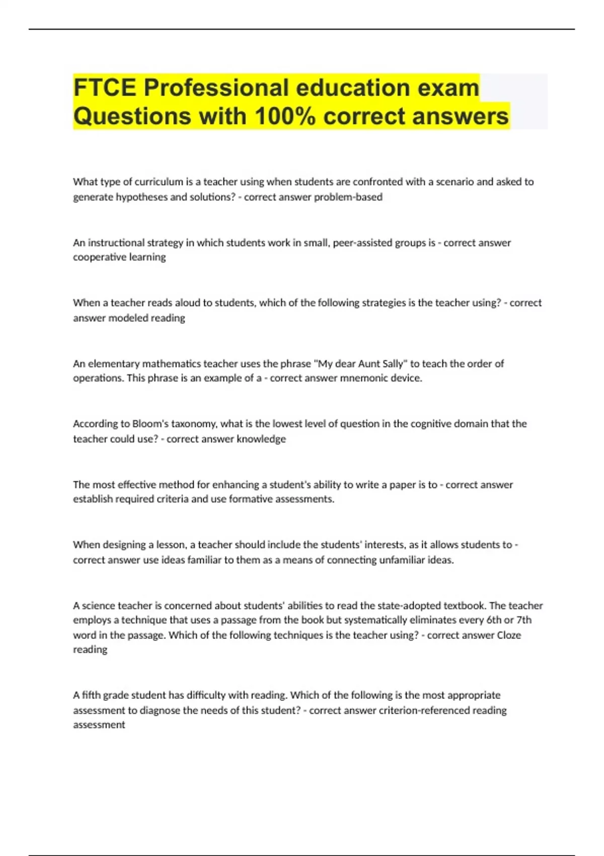 What type of curriculum is a teacher using when students are confronted with a scenario and asked to generate hypotheses and solutions? - correct answer problem-based An instructional strategy in which students work in small, peer-assisted groups is - correct answer cooperative learning When a teacher reads aloud to students, which of the following strategies is the teacher using? - correct answer modeled reading An elementary mathematics teacher uses the phrase "My dear Aunt Sally" to teach the order of operations. This phrase is an example of a - correct answer mnemonic device. According to Bloom's taxonomy, what is the lowest level of question in the cognitive domain that the teacher could use? - correct answer knowledge The most effective method for enhancing a student's ability to write a paper is to - correct answer establish required criteria and use formative assessments. When designing a lesson, a teacher should include the students' interests, as it allows students to - correct answer use ideas familiar to them as a means of connecting unfamiliar ideas. A science teacher is concerned about students' abilities to read the state-adopted textbook. The teacher employs a technique that uses a passage from the book but systematically eliminates every 6th or 7th word in the passage. Which of the following techniques is the teacher using? - correct answer Cloze reading A fifth grade student has difficulty with reading. Which of the following is the most appropriate assessment to diagnose the needs of this student? - correct answer criterion-referenced reading assessment A high school social studies teacher is asked to choose between two different American history textbooks. When deciding which textbook to use for classroom instruction, the teacher should - correct answer compare each book to the established district and state curriculum standards for the course Which of the following assessment strategies involves the systematic collection of students' work? - correct answer Portfolio A student has recently begun to struggle with staying focused on class material and frequently forgets to turn in completed assignments. The student's grades are below ability level. Which of the following interventions would be most appropriate? - correct answer verbal encouragement and visual cues KWL charts, Venn diagrams, thematic webs, concept maps, cause and effect charts, timelines, and T-charts are all examples of - correct answer graphic organizers. What initial action should a teacher take prior to requesting that a student be evaluated for special education services? - correct answer meeting with the parents to discuss alternatives for meeting the student's needs During an instructional unit focusing on alcohol, tobacco, and other drugs, students ask several questions that the teacher is uncomfortable answering. Which of the following is the most appropriate way to handle the student inquiries? - correct answer inviting a presenter from the local drug and alcohol outreach program to speak and respond to student questions A student has excessive absences from school, and the teacher is concerned about how the absences are affecting the student's academic progress. Which of the following is the most appropriate action for the teacher to take first? - correct answer holding a student-teacher conference Portfolio assessment is an effective way to evaluate the writing products of English language learners because it - correct answer allows the teacher to evaluate student growth over time Which of the following examples expresses how a cognitive theorist views learning? - correct answer Learning involves the acquisition of knowledge and skills, the formation of mental structures, and the processing of i