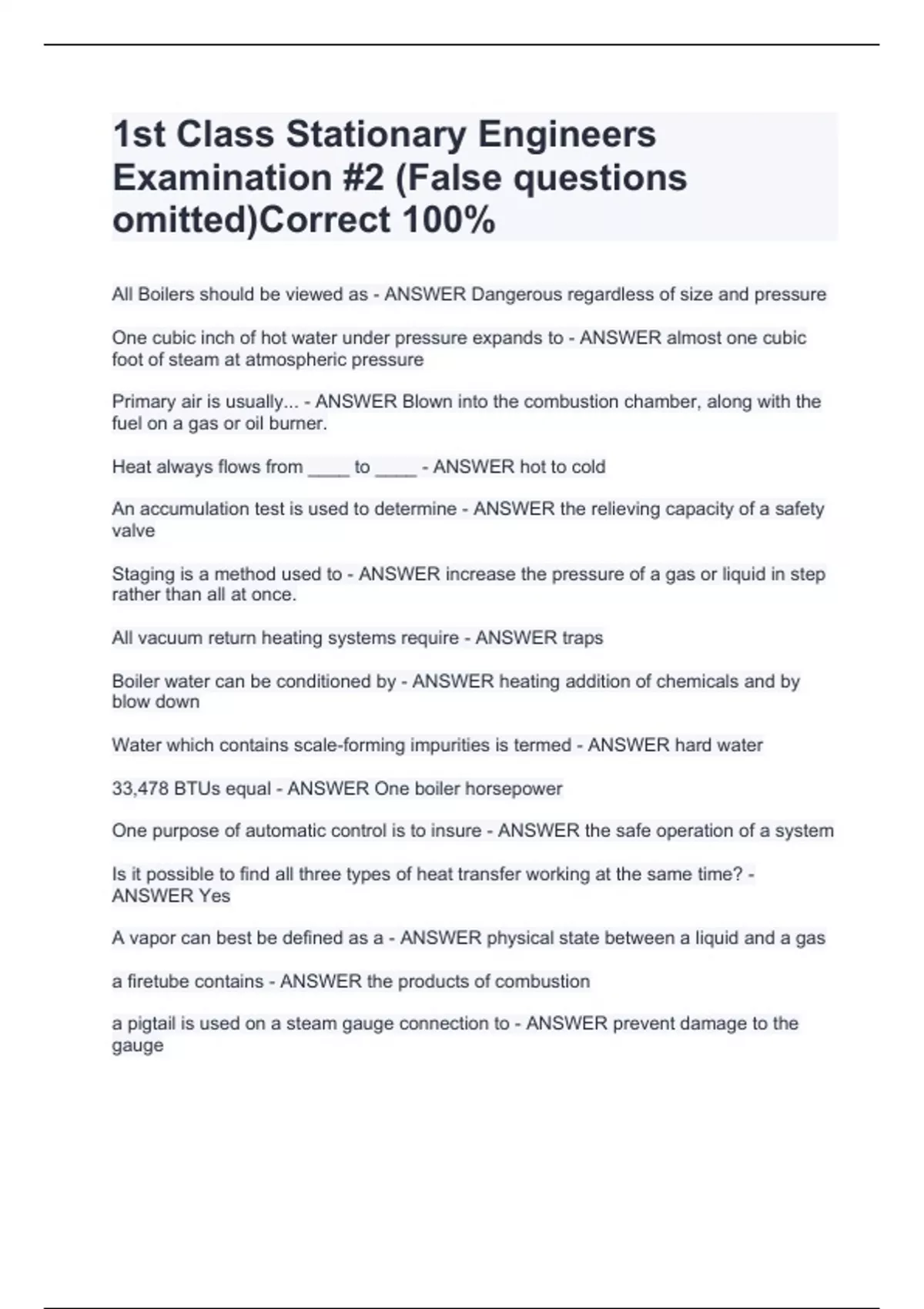 All Boilers should be viewed as - ANSWER Dangerous regardless of size and pressure One cubic inch of hot water under pressure expands to - ANSWER almost one cubic foot of steam at atmospheric pressure Primary air is usually... - ANSWER Blown into the combustion chamber, along with the fuel on a gas or oil burner. Heat always flows from ____ to ____ - ANSWER hot to cold An accumulation test is used to determine - ANSWER the relieving capacity of a safety valve Staging is a method used to - ANSWER increase the pressure of a gas or liquid in step rather than all at once. All vacuum return heating systems require - ANSWER traps Boiler water can be conditioned by - ANSWER heating addition of chemicals and by blow down Water which contains scale-forming impurities is termed - ANSWER hard water 33,478 BTUs equal - ANSWER One boiler horsepower One purpose of automatic control is to insure - ANSWER the safe operation of a system Is it possible to find all three types of heat transfer working at the same time? - ANSWER Yes A vapor can best be defined as a - ANSWER physical state between a liquid and a gas a firetube contains - ANSWER the products of combustion a pigtail is used on a steam gauge connection to