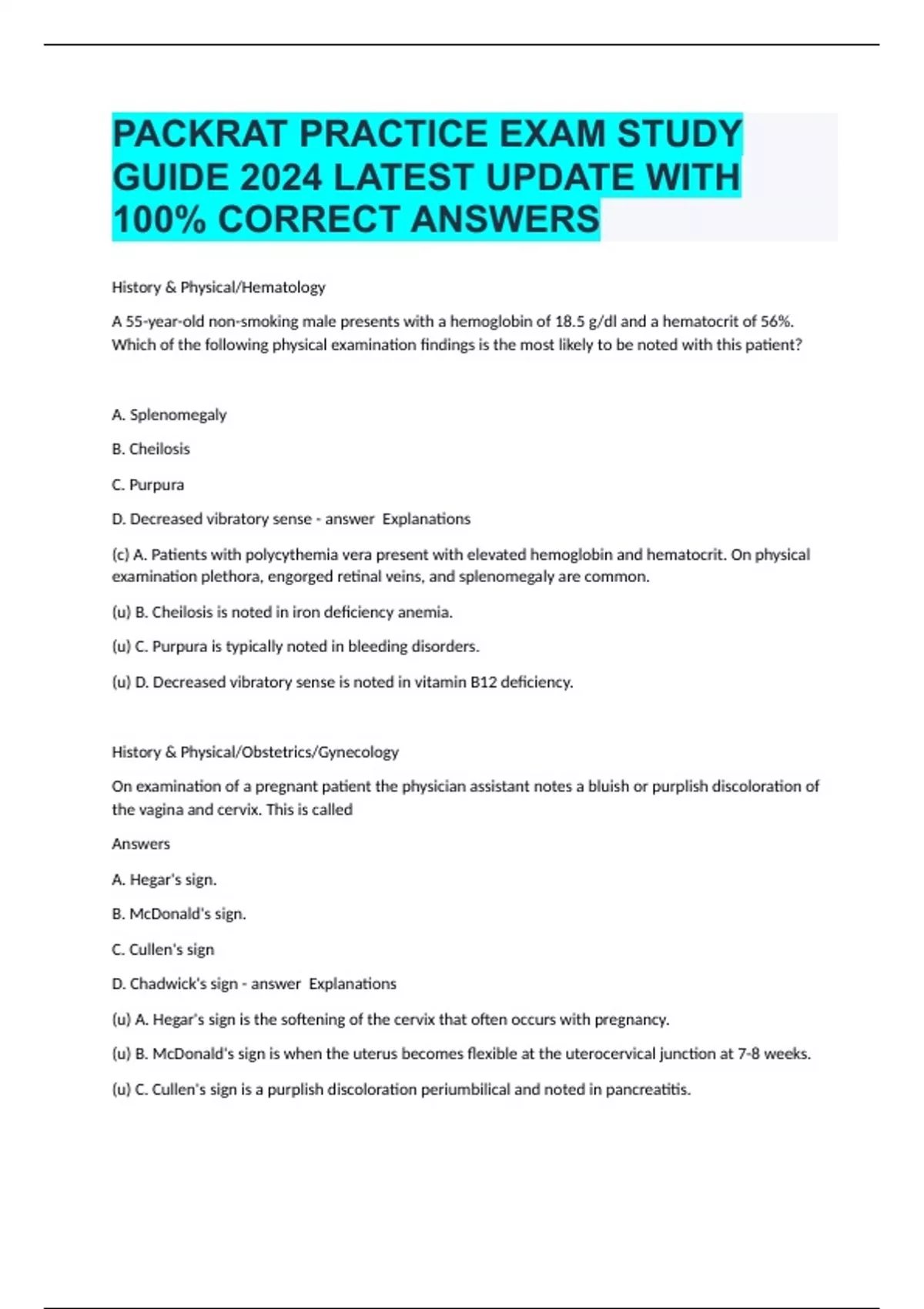 History & Physical/Hematology A 55-year-old non-smoking male presents with a hemoglobin of 18.5 g/dl and a hematocrit of 56%. Which of the following physical examination findings is the most likely to be noted with this patient? A. Splenomegaly B. Cheilosis C. Purpura D. Decreased vibratory sense Explanations (c) A. Patients with polycythemia vera present with elevated hemoglobin and hematocrit. On physical examination plethora, engorged retinal veins, and splenomegaly are common. (u) B. Cheilosis is noted in iron deficiency anemia. (u) C. Purpura is typically noted in bleeding disorders. (u) D. Decreased vibratory sense is noted in vitamin B12 deficiency. History & Physical/Obstetrics/Gynecology On examination of a pregnant patient the physician assistant notes a bluish or purplish discoloration of the vagina and cervix. This is called Answers A. Hegar's sign. B. McDonald's sign. C. Cullen's sign D. Chadwick's sign Explanations (u) A. Hegar's sign is the softening of the cervix that often occurs with pregnancy. (u) B. McDonald's sign is when the uterus becomes flexible at the uterocervical junction at 7-8 weeks. (u) C. Cullen's sign is a purplish discoloration periumbilical and noted in pancreatitis. (c) D. Chadwick's sign is a bluish or purplish discoloration of the vagina and cervix. Brainpower Read More History & Physical/Orthopedics/Rheumatology Abduction of the shoulder against resistance helps localize pain in which of the following muscles of the shoulder girdle? Answers A. Supraspinatus B. Infraspinatus C. Teres minor D. Subscapularis Explanations (c) A. Abduction against resistance tests the supraspinatus. (u) B. Lateral rotation against resistance tests the infraspinatus and teres minor. (u) C. See B for explanation. (u) D. Medial rotation against resistance tests the subscapularis. History & Physical/Pulmonology A 45 year-old male presents with sudden onset of pleuritic chest pain, productive cough and fever for 1 day. He relates having symptoms of a "cold" for the past week that suddenly became worse yesterday. Which of the following findings will most likely be seen on physical examination of this patient? Answers A. spoken "ee" heard as "ay" B. hyperresonant percussion note C. wheezes over the involved area D. vesicular breath sounds over involved area Explanations (c) A. This patient most likely has a bacterial pneumonia with consolidation, which would produce egophony, where a spoken "ee" is heard as "ay." (u) B. Consolidation from bacterial pneumonia causes findings of dullness to percussion, late inspiratory crackles and bronchial breath sounds over the involved area. (u) C. See explanation B. (u) D. See explanation B. History & Physical/ENT/Ophthalmology A 4 year-old child presents with a rapid onset of high fever and extremely sore throat. Which of the following findings are suggestive of the diagnosis of epiglottitis? Answers A. Croupy cough and drooling B. Thick gray, adherent exudate C. Beefy red uvula, palatal petechiae, white exudate D. Inflammation and medial protrusion of one tonsil Explanations (c) A. A croupy cough with drooling in a patient who appears very ill is consistent with epiglottitis. Examining the throat is contraindicated, unless the airway can be maintained. (u) B. Thick gray adherent exudate is suggestive of diphtheria. (u) C. Beefy red uvula, palatal petechiae, and white exudate are findings suggestive of streptococcal pharyngitis. (u) D. Inflammation with medial protrusion of the tonsil is suggestive of a peritonsillar abscess. Which of the following is a common physical examination finding in early intestinal obstruction? A. high fever. B. profuse flatulence. C. rebound tenderness D. hyperactive, high-pitched bowel sounds (u) A. Fever and rebound tenderness occur only if a perforation has occurred. (u) B. Profuse flatulence is not noted in early intestinal obstruction. (u) C. See A for explanation. (c) D. Abdominal distention and high-pitched, hyperactive bowel sounds are common in early intestinal obstruction. History & Physical/Endocrinology A 26-year-old obese female complains of a 3-4 month history of discrete erythematous plaques on the pretibial areas of her legs. The lesions have increased in size, become darker, and are painful. She is concerned because the centers of the lesions have become ulcerated. This patient should be screened for which of the following? Answers A. Hypothyroidism B. Diabetes mellitus C. Melanoma D. Scleroderma Explanations (u) A. In hypothyroidism the skin of the pretibial area may thicken leading to edema. This is a diffuse finding, involving the face and eyelids, without discrete lesions. (c) B. The description of the skin lesions is characteristic of necrobiosis lipoidica diabeticorum, one of the dermatologic manifestations of diabetes mellitus. (u) C. The lesions of melanoma are typically not painful and do not ulcerate. (u) D. Scleroderma is marked by thickening of the skin, with swelling of the fingers and hands. The swelling may involve the forearms and face; the lower extremities are relatively spared. History & Physical/Neurology A 73 year-old male presents to the clinic with his wife. His wife has noticed that he has developed a resting tremor in his right hand and a shuffling gait over the last year. What finding on physical examination would support your suspected diagnosis? Answers A. Chorea B. Dystonia C. Masked facies D. Hyperreflexia Explanations (u) A. See C for explanation. (u) B. See C for explanation. (c) C. The patient symptoms are consistent with Parkinsonism. Physical exam findings include masked facies, micrographia, decreased arm swing, and monotonous speech. (u) D. See C for explanation. History & Physical/Psychiatry/Behavioral Medicine Which of the following historical factors differentiates post-traumatic stress disorder from acute stress disorder? Answers A. The inability of the person to recall an important aspect of the event. B. Avoidance of stimuli that invokes recollections of
