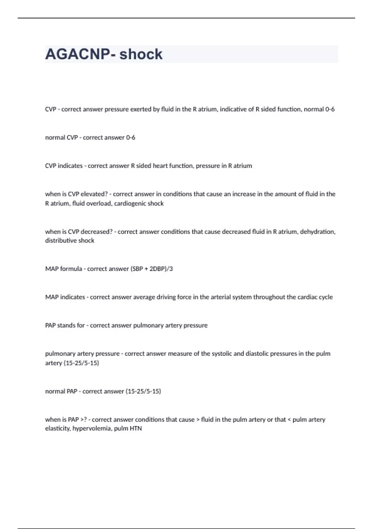 CVP - correct answer pressure exerted by fluid in the R atrium, indicative of R sided function, normal 0-6 normal CVP - correct answer 0-6 CVP indicates - correct answer R sided heart function, pressure in R atrium when is CVP elevated? - correct answer in conditions that cause an increase in the amount of fluid in the R atrium, fluid overload, cardiogenic shock when is CVP decreased? - correct answer conditions that cause decreased fluid in R atrium, dehydration, distributive shock MAP formula - correct answer (SBP + 2DBP)/3 MAP indicates - correct answer average driving force in the arterial system throughout the cardiac cycle PAP stands for - correct answer pulmonary artery pressure pulmonary artery pressure - correct answer measure of the systolic and diastolic pressures in the pulm artery (15-25/5-15) n