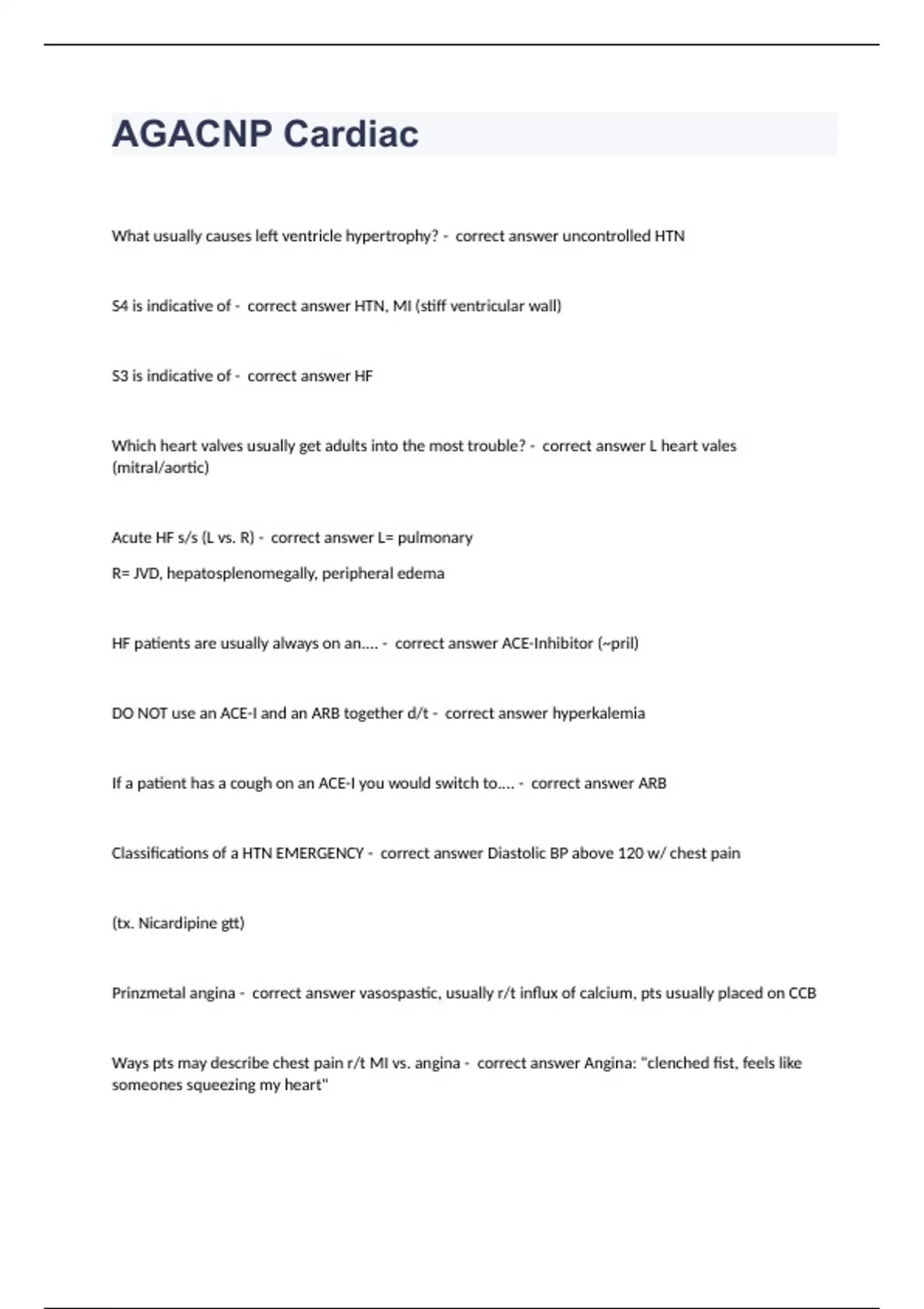 What usually causes left ventricle hypertrophy? - correct answer uncontrolled HTN S4 is indicative of - correct answer HTN, MI (stiff ventricular wall) S3 is indicative of - correct answer HF Which heart valves usually get adults into the most trouble? - correct answer L heart vales (mitral/aortic) Acute HF s/s (L vs. R) - correct answer L= pulmonary R= JVD, hepatosplenomegally, peripheral edema HF patients are usually always on an.... - correct answer ACE-Inhibitor (~pril) DO NOT use an ACE-I and an ARB together d/t - correct answer hyperkalemia If a patient has a cough on an ACE-I you would switch to.... - correct answer ARB Classifications of a HTN EMERGENCY - correct answer Diastolic BP above 120 w/ chest pain (tx. Nicardipine gtt)