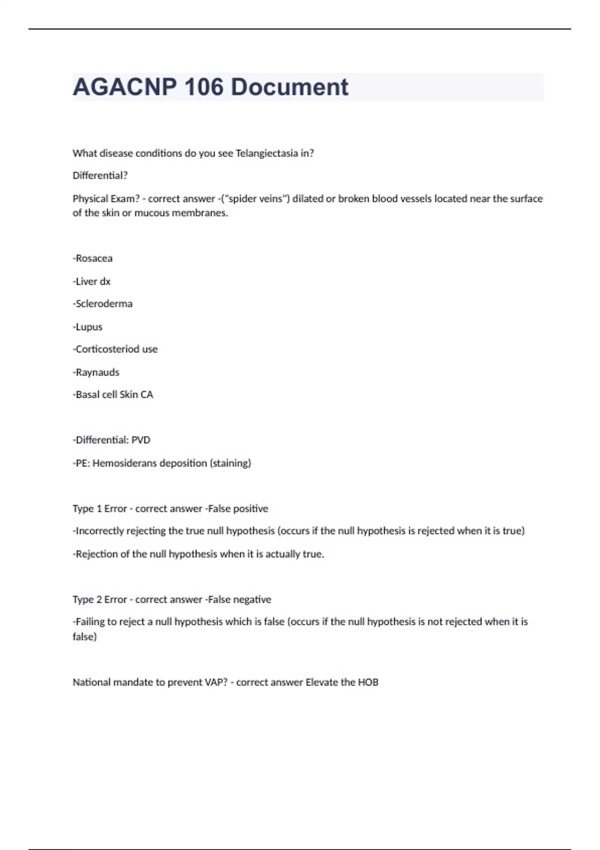 What disease conditions do you see Telangiectasia in? Differential? Physical Exam? - correct answer -("spider veins") dilated or broken blood vessels located near the surface of the skin or mucous membranes. -Rosacea -Liver dx -Scleroderma -Lupus -Corticosteriod use -Raynauds -Basal cell Skin CA -Differential: PVD -PE: Hemosiderans deposition (staining) Type 1 Error - correct answer -False positive -Incorrectly rejecting the true null hypothesis (occurs if the null hypothesis is rejected when it is true) -Rejection of the null hypothesis when it is actually true. Type 2 Error - correct answer -False negative -Failing to reject a null hypothesis which is false (occurs if the null hypothesis is not rejected when it is false) National mandate to prevent VAP? - correct answer Elevate the HOB