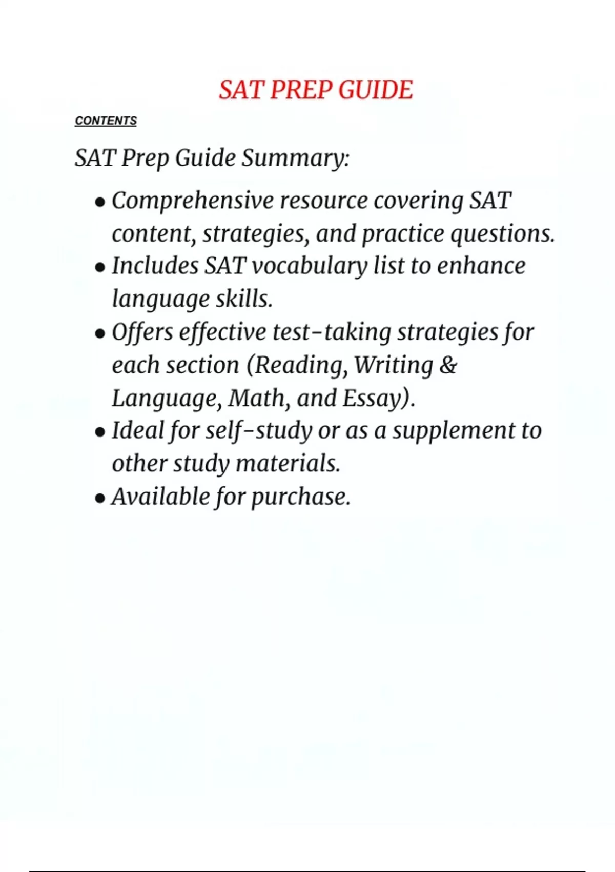 SAT Prep Guide Summary: Comprehensive resource covering SAT content, strategies, and practice questions. Includes SAT vocabulary list to enhance language skills. Offers effective test-taking strategies for each section (Reading, Writing & Language, Math, and Essay). Ideal for self-study or as a supplement to other study materials. Available for purchase.