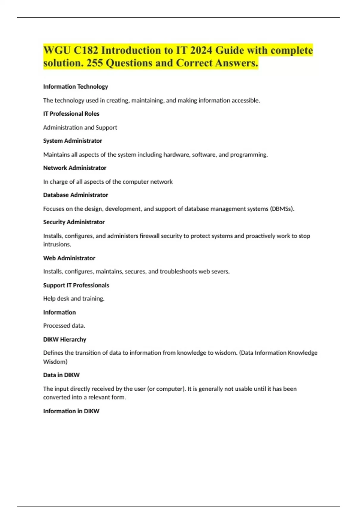 WGU C182 Introduction to IT 2024 Guide with complete solution. 255 Questions and Correct Answers.
