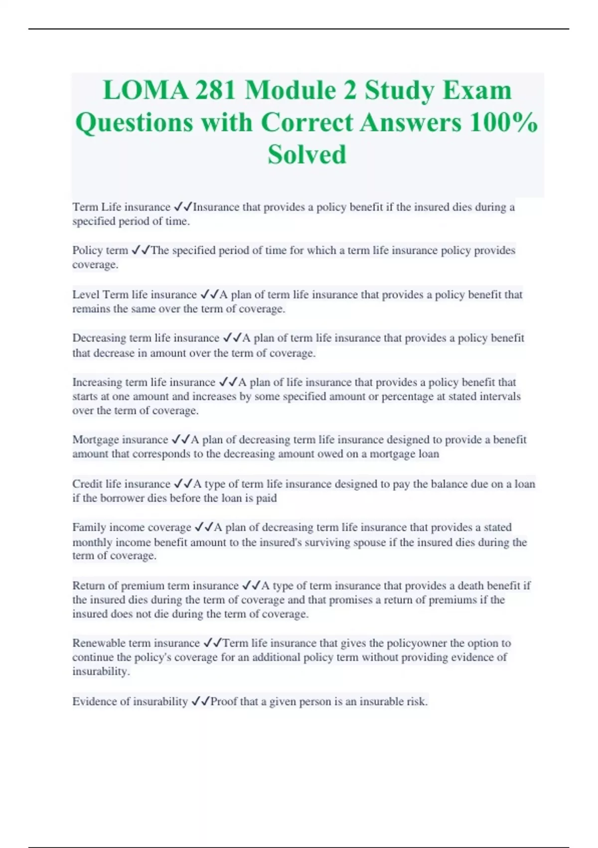 LOMA 281 Module 2 Study Exam Questions with Correct Answers 100% Solved Term Life insurance Insurance that provides a policy benefit if the insured dies during a specified period of time. Policy term The specified period of time for which a term life insurance policy provides coverage. Level Term life insurance A plan of term life insurance that provides a policy benefit that remains the same over the term of coverage. Decreasing term life insurance A plan of term life insurance that provides a policy benefit that decrease in amount over the term of coverage.