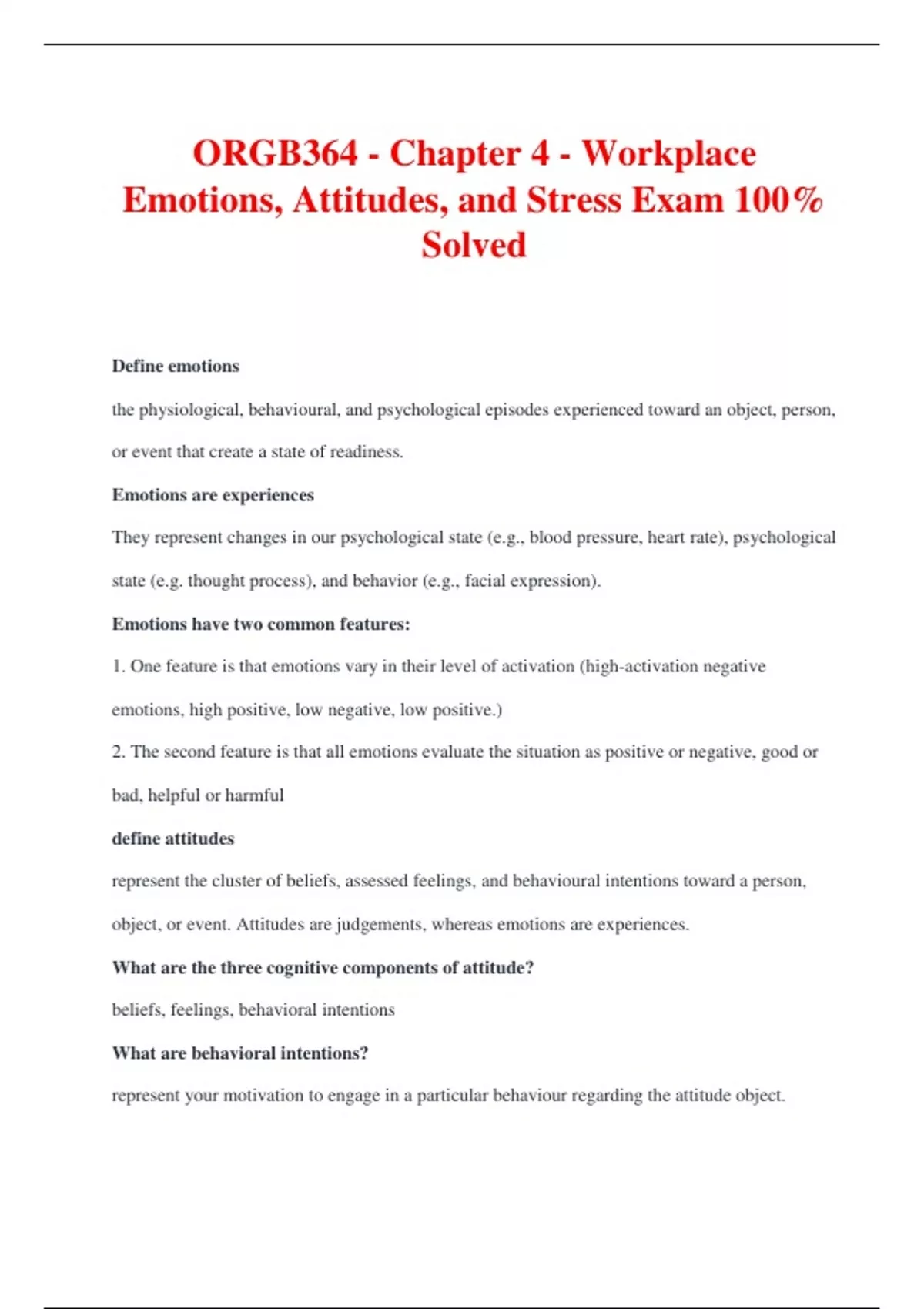 ORGB364 - Chapter 4 - Workplace Emotions, Attitudes, and Stress Exam 100% Solved Define emotions the physiological, behavioural, and psychological episodes experienced toward an object, person, or event that create a state of readiness. Emotions are experiences They represent changes in our psychological state (e.g., blood pressure, heart rate), psychological state (e.g. thought process), and behavior (e.g., facial expression). Emotions have two common features: 1. One feature is that emotions vary in their level of activation (high-activation negative emotions, high positive, low negative, low positive.) 2. The second feature is that all emotions evaluate the situation as positive or negative, good or bad, helpful or harmful define attitudes represent the cluster of beliefs, assessed feelings, and behavioural intentions toward a person, object, or event. Attitudes are judgements, whereas emotions are experiences. What are the three cognitive components of attitude? beliefs, feelings, behavioral intentions What are behavioral intentions? represent your motivation to engage in a particular behaviour regarding the attitude object.