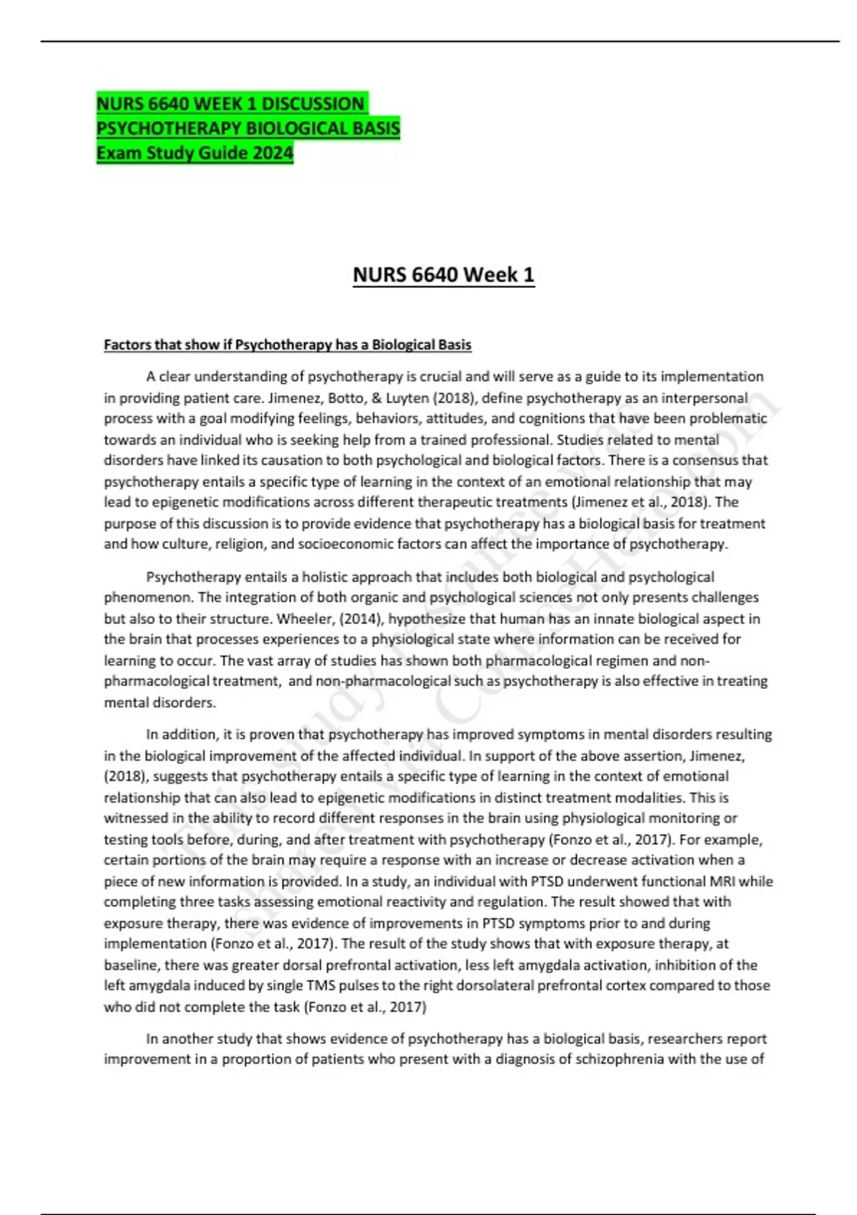 NURS 6640 WEEK 1 DISCUSSION PSYCHOTHERAPY BIOLOGICAL BASIS Exam Study Guide 2024