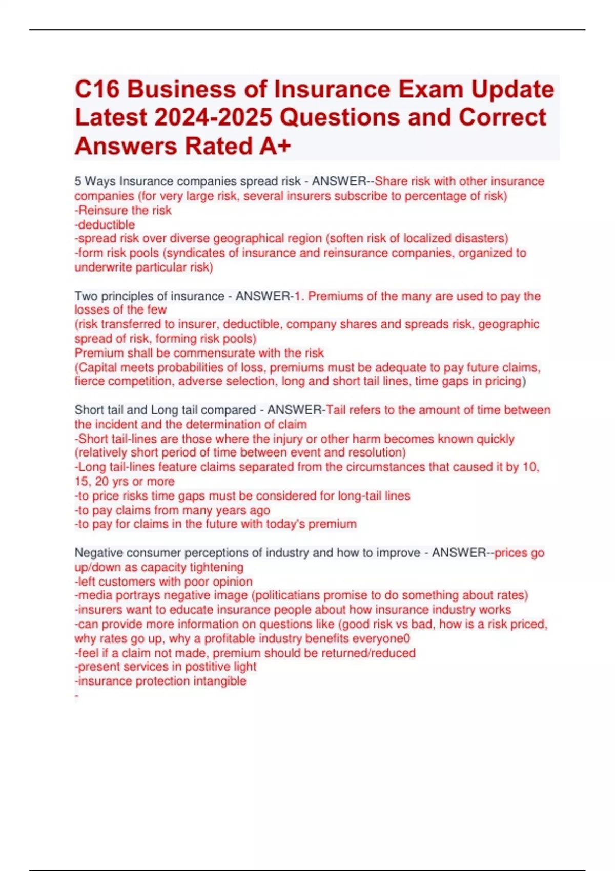 C16 Business of Insurance Exam Update Latest Questions and Correct Answers Rated A+