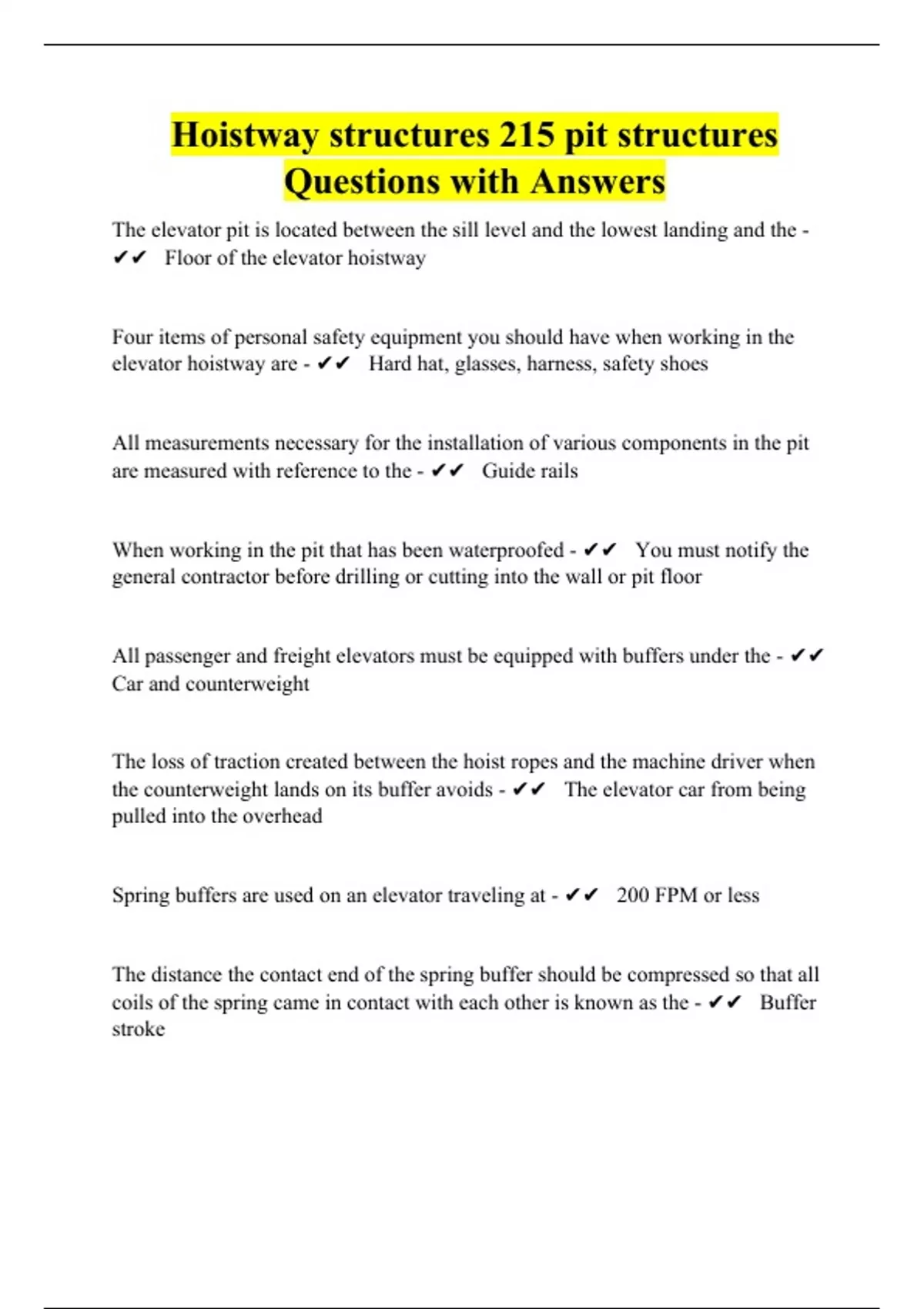 The elevator pit is located between the sill level and the lowest landing and the - Floor of the elevator hoistway Four items of personal safety equipment you should have when working in the elevator hoistway are - Hard hat, glasses, harness, safety shoes All measurements necessary for the installation of various components in the pit are measured with reference to the - Guide rails When working in the pit that has been waterproofed - You must notify the general contractor before drilling or cutting into the wall or pit floor All passenger and freight elevators must be equipped with buffers under the - Car and counterweight The loss of traction created between the hoist ropes and the machine driver when the counterweight lands on its buffer avoids - The elevator car from being pulled into the overhead Spring buffers are used on an elevator traveling at - 200 FPM or less The distance the contact end of the spring buffer should be compressed so that all coils of the spring came in contact with each other is known as the - Buffer stroke A spring buffer must hold ___ the static load of the loaded car or the counterweight without being compressed solid - Twice When one spring buffer is used, it should be installed so that the vertical centerline is within ___ inches of the vertical centerline of the car or counterweight striking plate. - Two Before permanently mounting the assembled buffer channel to the guide rail or counterweight rail, check - That the channel is at the proper floor level, that the channel is level, and that the DBG distance is proper. The finished pit floor is normally poured to the - Lower web of the pit level Oil buffers are required on elevators having car speeds of - More than 200 FPM When an oil buffer is part of the counterweight instead of being installed in the pit under the counterweight, it is called a - Gravity return