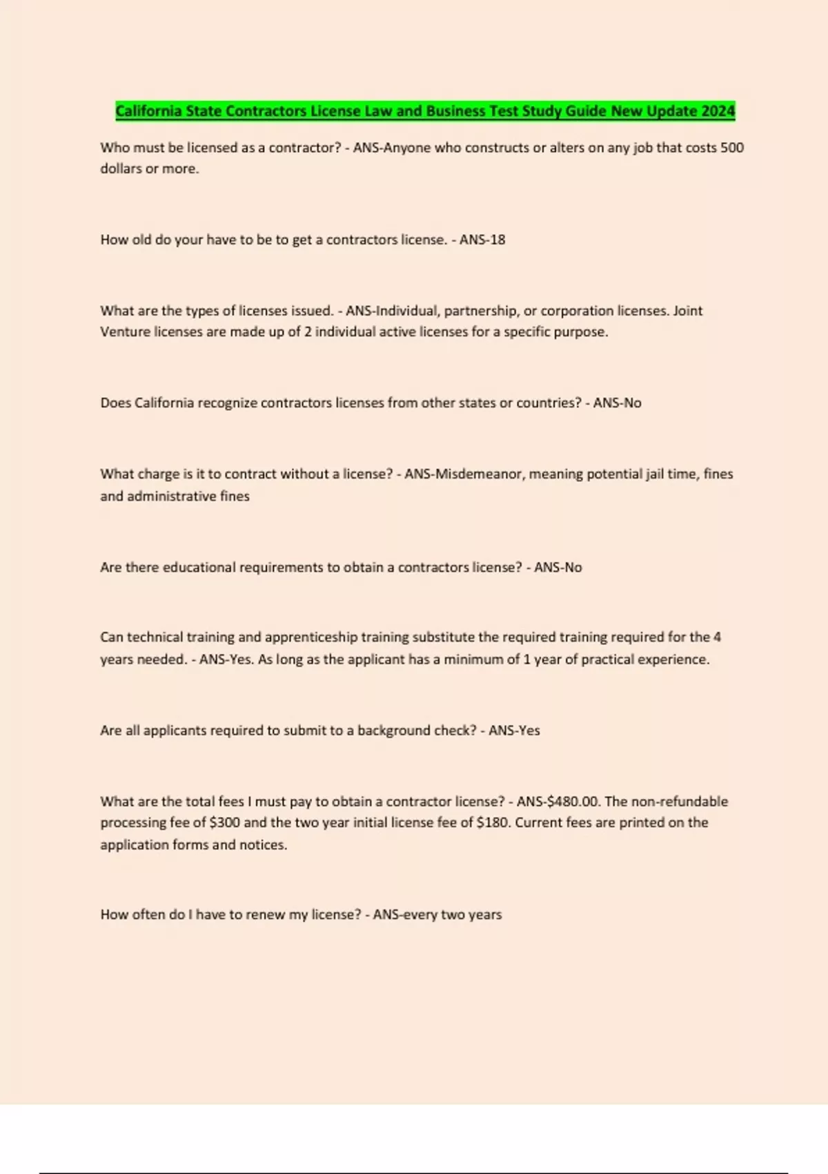 California State Contractors License Law and Business Test Study Guide New Update 2024 Who must be licensed as a contractor? - ANS-Anyone who constructs or alters on any job that costs 500 dollars or more. How old do your have to be to get a contractors license. - ANS-18 What are the types of licenses issued. - ANS-Individual, partnership, or corporation licenses. Joint Venture licenses are made up of 2 individual active licenses for a specific purpose. Does California recognize contractors licenses from other states or countries? - ANS-No What charge is it to contract without a license? - ANS-Misdemeanor, meaning potential jail time, fines and administrative fines Are there educational requirements to obtain a contractors license? - ANS-No Can technical training and apprenticeship training substitute the required training required for the 4 years needed. - ANS-Yes. As long as the applicant has a minimum of 1 year of practical experience. Are all applicants required to submit to a background check? - ANS-Yes What are the total fees I must pay to obtain a contractor license? - ANS-$480.00. The non-refundable processing fee of $300 and the two year initial license fee of $180. Current fees are printed on the application forms and notices. How often do I have to renew my license? - CONTINUES...