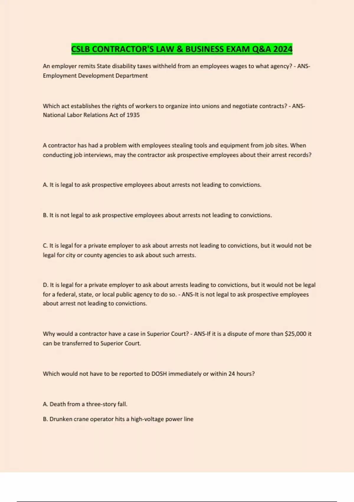 CSLB CONTRACTOR'S LAW & BUSINESS EXAM Q&A 2024 An employer remits State disability taxes withheld from an employees wages to what agency? - ANSEmployment Development Department Which act establishes the rights of workers to organize into unions and negotiate contracts? - ANSNational Labor Relations Act of 1935 A contractor has had a problem with employees stealing tools and equipment from job sites. When conducting job interviews, may the contractor ask prospective employees about their arrest records? A. It is legal to ask prospective employees about arrests not leading to convictions. B. It is not legal to ask prospective employees about arrests not leading to convictions. C. It is legal for a private employer to ask about arrests not leading to convictions, but it would not be legal for city or county agencies to ask about such arrests. D. It is legal for a private employer to ask about arrests leading to convictions, but it would not be legal for a federal, state, or local public agency to do so. - ANS-It is not legal to ask prospective employees about arrest not leading to convictions. Why would a contractor have a case in Superior Court? - ANS-If it is a dispute of more than $25,000 it can be transferred to Superior Court. Which would not have to be reported to DOSH immediately or within 24 hours? A. Death from a three-story fall. B. Drunken crane operator hits a high-voltage power line C. Car accident in which an employee steps onto a public road, gets hit by a car, and suffers a concussion. D. Employee falls off forklift and suffers a sever back injury. - ANS-Car accident in which an employee steps onto a public road, gets hit by a car, and suffers a concussion. A general contractor has obtained bids from several subcontractors for a private project. He notices that one bid is substantially lower than the rest. Is it ethical and a good business practice for this contractor to inform the subcontractor that the bid is substantially lower than the bids of the other subcontractors? - ANS-Yes. If the contractor has reason to believe that the subcontractor has made an error in preparing his bid, the contractor should notify the subcontractor of the apparent error, but the contractor may not disclose the amounts of the other bids. An employer must furnish an employee with a completed IRS Form W-2 (Wage and Tax Statement) by: - ANS-The 31st of January. After a job is completed, the owner decides to have additional work done. How should the contractor proceed? - ANS-Write a new contract and ask the owner to sign it. The purpose of a 20-day preliminary notice for private work is to? - ANS-Notify the owner that the person or firm who sent the notice has improved the property. Is it legal for a contractor to pay employees in cash? - ANS-Yes, if the contractor provides each employee with a wage deduction statement semimonthly or at the time of each wage payment. You are bidding on a job with plans drawn by the owner. You notice a code violation and bring it to the attention of the owner. The owner declines to remedy the code violation and tells you not to worry. What should you do? - A...