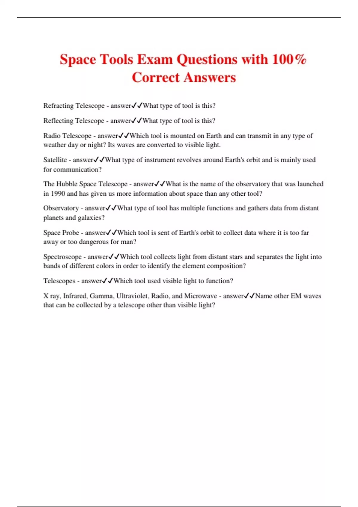 Space Tools Exam Questions with 100% Correct Answers Refracting Telescope - answerWhat type of tool is this? Reflecting Telescope - answerWhat type of tool is this? Radio Telescope - answerWhich tool is mounted on Earth and can transmit in any type of weather day or night? Its waves are converted to visible light. Satellite - answerWhat type of instrument revolves around Earth's orbit and is mainly used for communication? The Hubble Space Telescope - answerWhat is the name of the observatory that was launched in 1990 and has given us more information about space than any other tool? Observatory - answerWhat type of tool has multiple functions and gathers data from distant planets and galaxies?