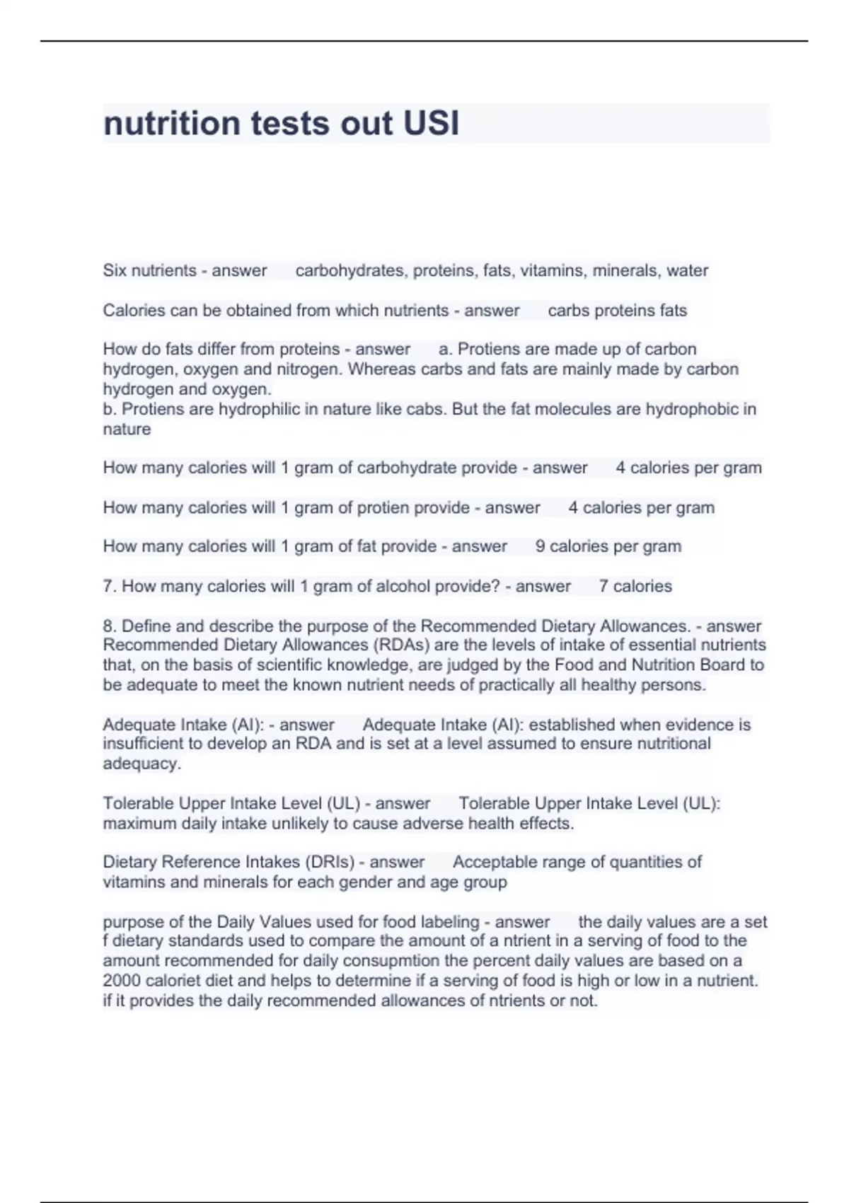 nutrition tests out USI Questions and Answers 2024
