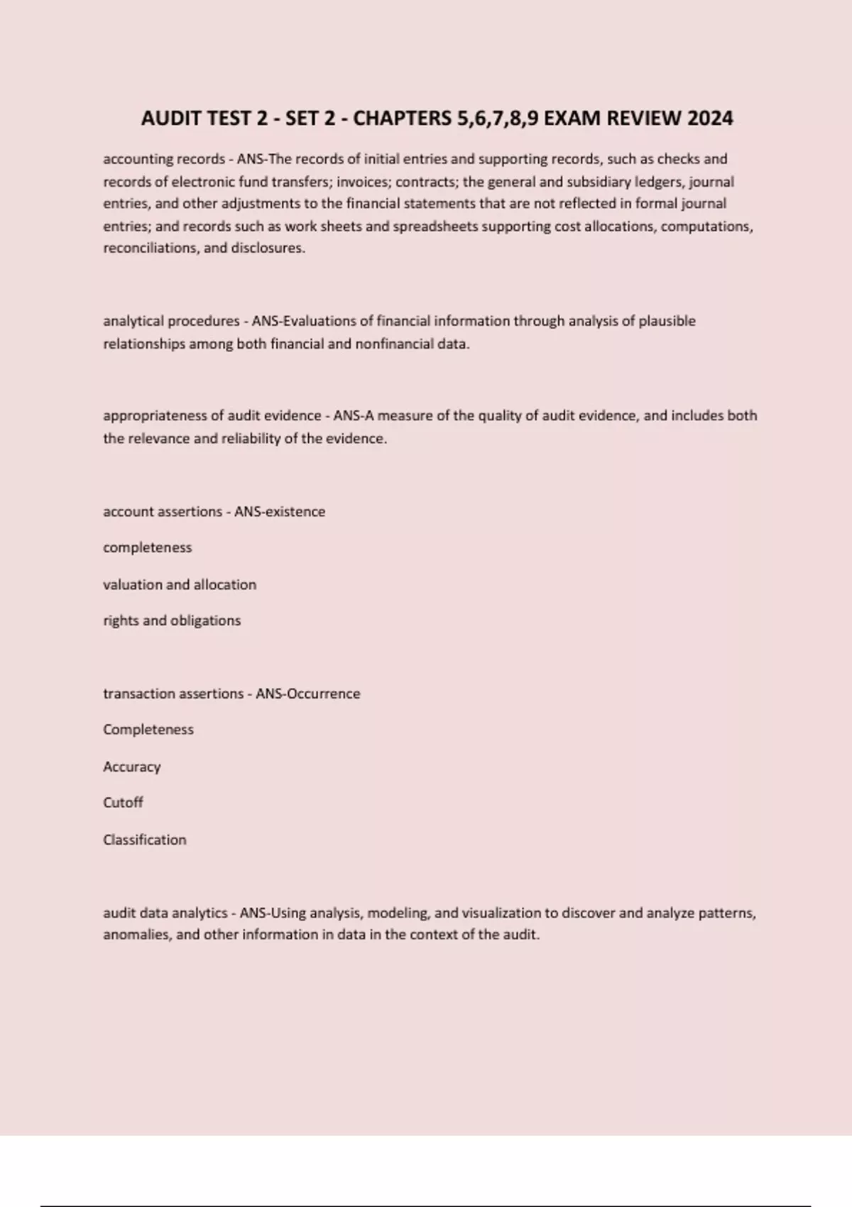 AUDIT TEST 2 - SET 2 - CHAPTERS 5,6,7,8,9 EXAM REVIEW 2024 accounting records - ANS-The records of initial entries and supporting records, such as checks and records of electronic fund transfers; invoices; contracts; the general and subsidiary ledgers, journal entries, and other adjustments to the financial statements that are not reflected in formal journal entries; and records such as work sheets and spreadsheets supporting cost allocations, computations, reconciliations, and disclosures. analytical procedures - ANS-Evaluations of financial information through analysis of plausible relationships among both financial and nonfinancial data. appropriateness of audit evidence - ANS-A measure of the quality of audit evidence, and includes both the relevance and reliability of the evidence. account assertions - ANS-existence completeness valuation and allocation rights and obligations transaction assertions - ANS-Occurrence Completeness Accuracy Cutoff Classification audit data analytics - ANS-Using analysis, modeling, and visualization to discover and analyze patterns, anomalies, and other information in data in the context of the audit. CONTINUES...