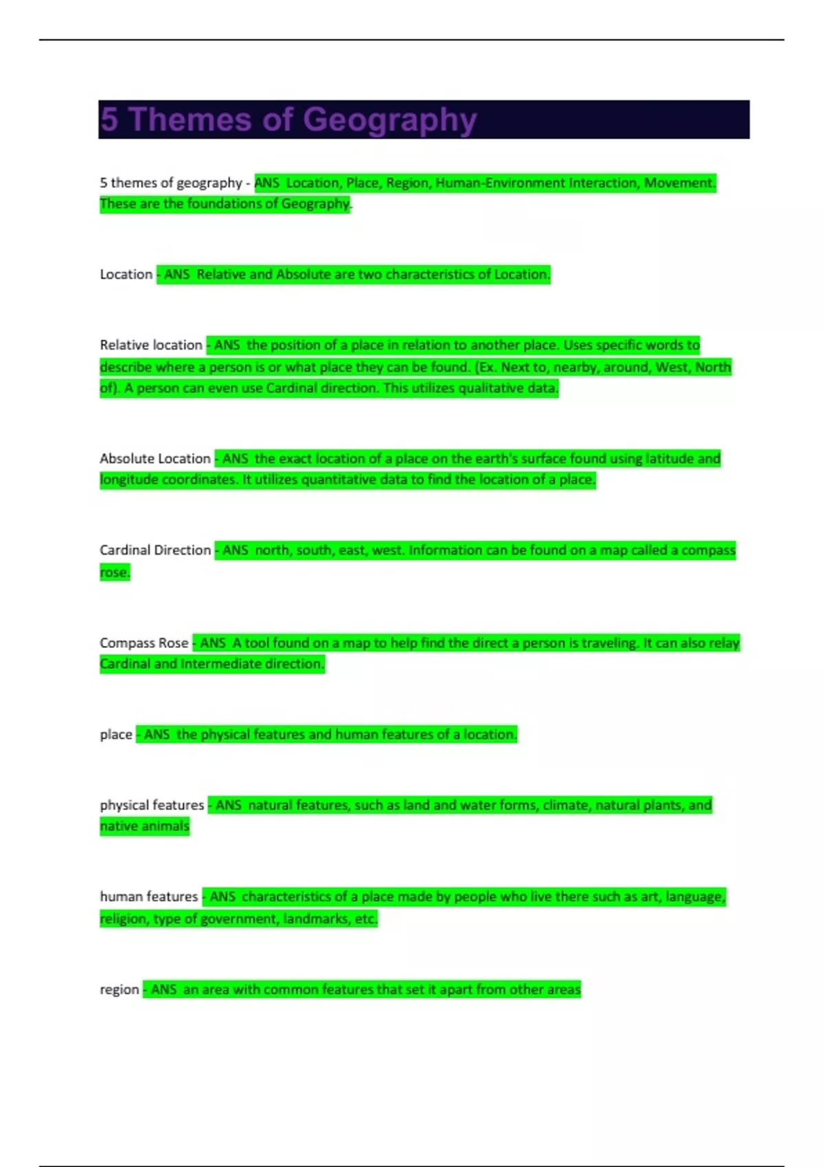 5 themes of geography - ANS Location, Place, Region, Human-Environment Interaction, Movement. These are the foundations of Geography. Location - ANS Relative and Absolute are two characteristics of Location. Relative location - ANS the position of a place in relation to another place. Uses specific words to describe where a person is or what place they can be found. (Ex. Next to, nearby, around, West, North of). A person can even use Cardinal direction. This utilizes qualitative data. Absolute Location - ANS the exact location of a place on the earth's surface found using latitude and longitude coordinates. It utilizes quantitative data to find the location of a place. Cardinal Direction - ANS north, south, east, west. Information can be found on a map called a compass rose. Compass Rose - ANS A tool found on a map to help find the direct a person is traveling. It can also relay Cardinal and Intermediate direction. place - ANS the physical features and human features of a location. physical features - ANS natural features, such as land and water forms, climate, natural plants, and native animals human features - ANS characteristics of a place made by people who live there such as art, language, religion, type of government, landmarks, etc. region - ANS an area with common features that set it apart from other areas
