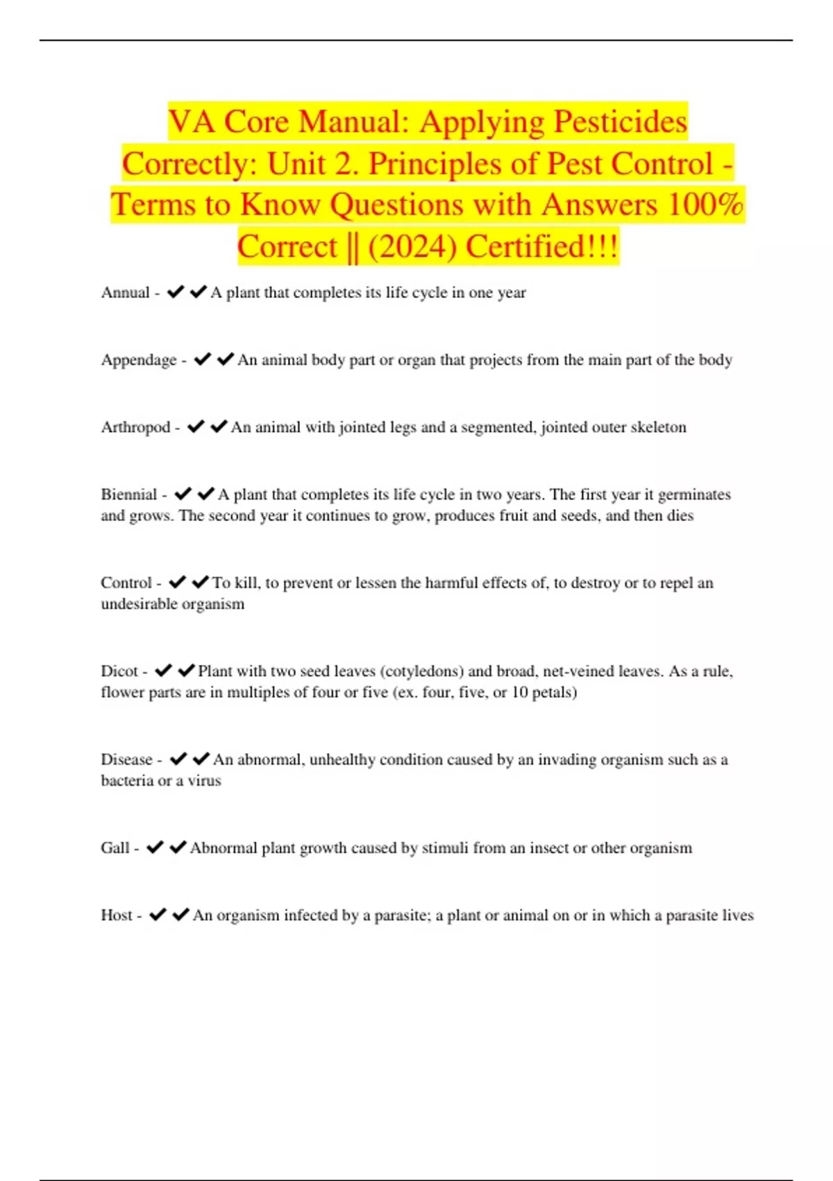 VA Core Manual: Applying Pesticides Correctly: Unit 2. Principles of Pest Control - Terms to Know Questions with Answers 100% Correct || (2024) Certified!!!