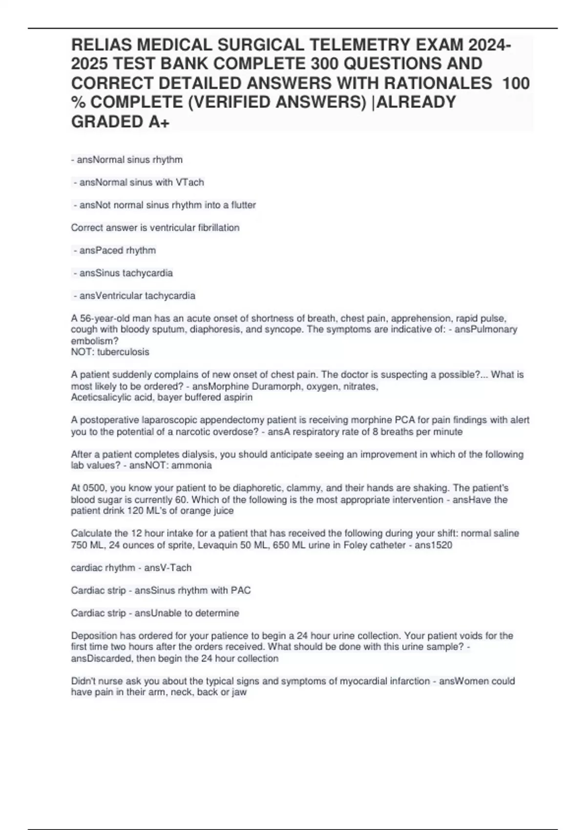 RELIAS MEDICAL SURGICAL TELEMETRY EXAM TEST BANK COMPLETE 300 QUESTIONS AND CORRECT DETAILED ANSWERS WITH RATIONALES 100 % COMPLETE (VERIFIED ANSWERS) ALREADY GRADED A+
