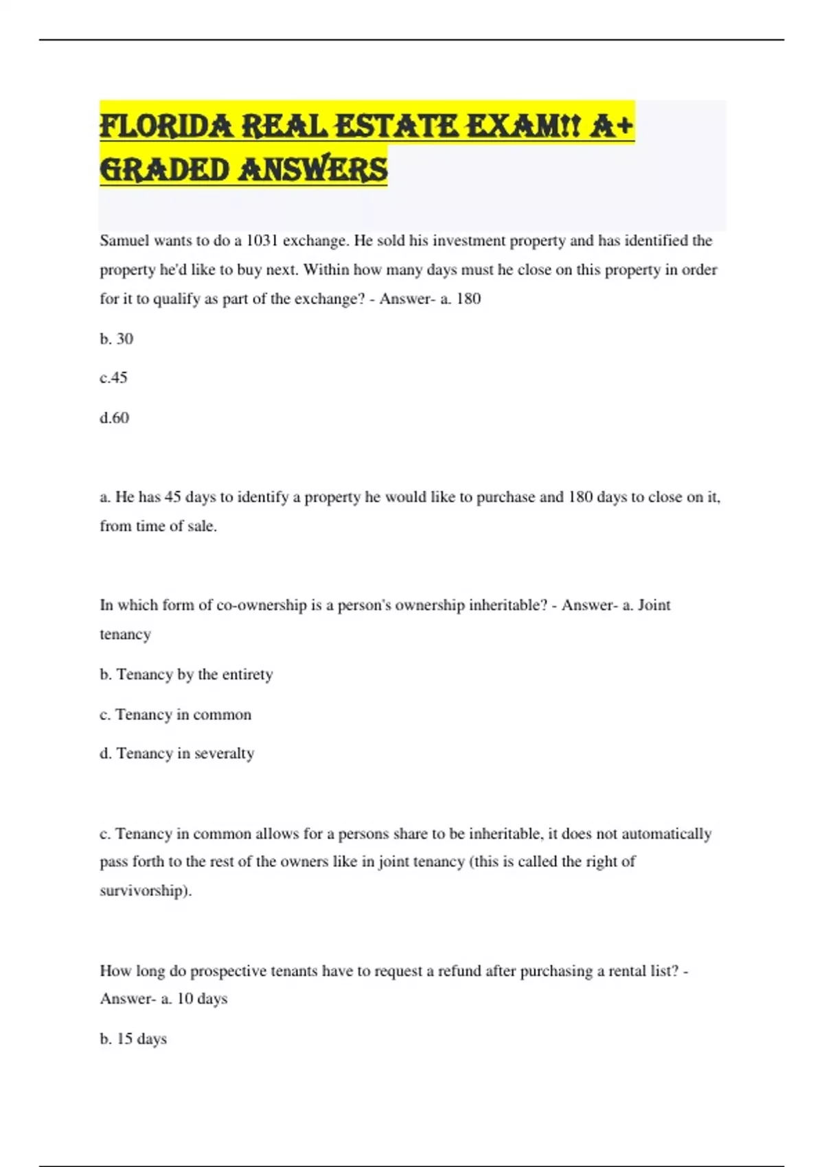 Samuel wants to do a 1031 exchange. He sold his investment property and has identified the property he'd like to buy next. Within how many days must he close on this property in order for it to qualify as part of the exchange? - Answer- a. 180 b. 30 c.45 d.60 a. He has 45 days to identify a property he would like to purchase and 180 days to close on it, from time of sale. In which form of co-ownership is a person's ownership inheritable? - Answer- a. Joint tenancy b. Tenancy by the entirety c. Tenancy in common d. Tenancy in severalty c. Tenancy in common allows for a persons share to be inheritable, it does not automatically pass forth to the rest of the owners like in joint tenancy (this is called the right of survivorship). How long do prospective tenants have to request a refund after purchasing a rental list? - Answer- a. 10 days b. 15 days c. 30 days d. 360 days C. 30 days.... tenants have up to 30 days to request a 75% refund if they do not purchase a rental Which method best describes the foreclosure process in Florida? - Answer- a. Caveat emptor b. Judicial c. Lis pendens d. Non-judicial b. The state of florida offers a judicial foreclosure process A judicial foreclosure is known as a lien theory process. Basically, the homeowner has legal title to the property... Unlike title theory, where as the owner has equitable title Which of the following statements about the Florida property tax disclosure is NOT true? - Answer- a. It can be included in the sales contract itself. b. It cautions buyers not to rely on the current year's tax to predict what they'll have to pay. c. It gives buyers a rough estimate of the property tax they'll pay in the coming year. d. It must be provided to sellers when they sign their agency agreement. c. This disclosure doesn't provide any estimates of future property tax amounts. Which act simplifies, clarifies, and modernizes consumer protection laws and makes them more consistent with federal trade laws? - Answer- a. Fair Housing Act b. Federal Duplicate Law Condensation Act c. Federal Trade Commission Act d. Florida Deceptive and Unfair Trade Practices Act