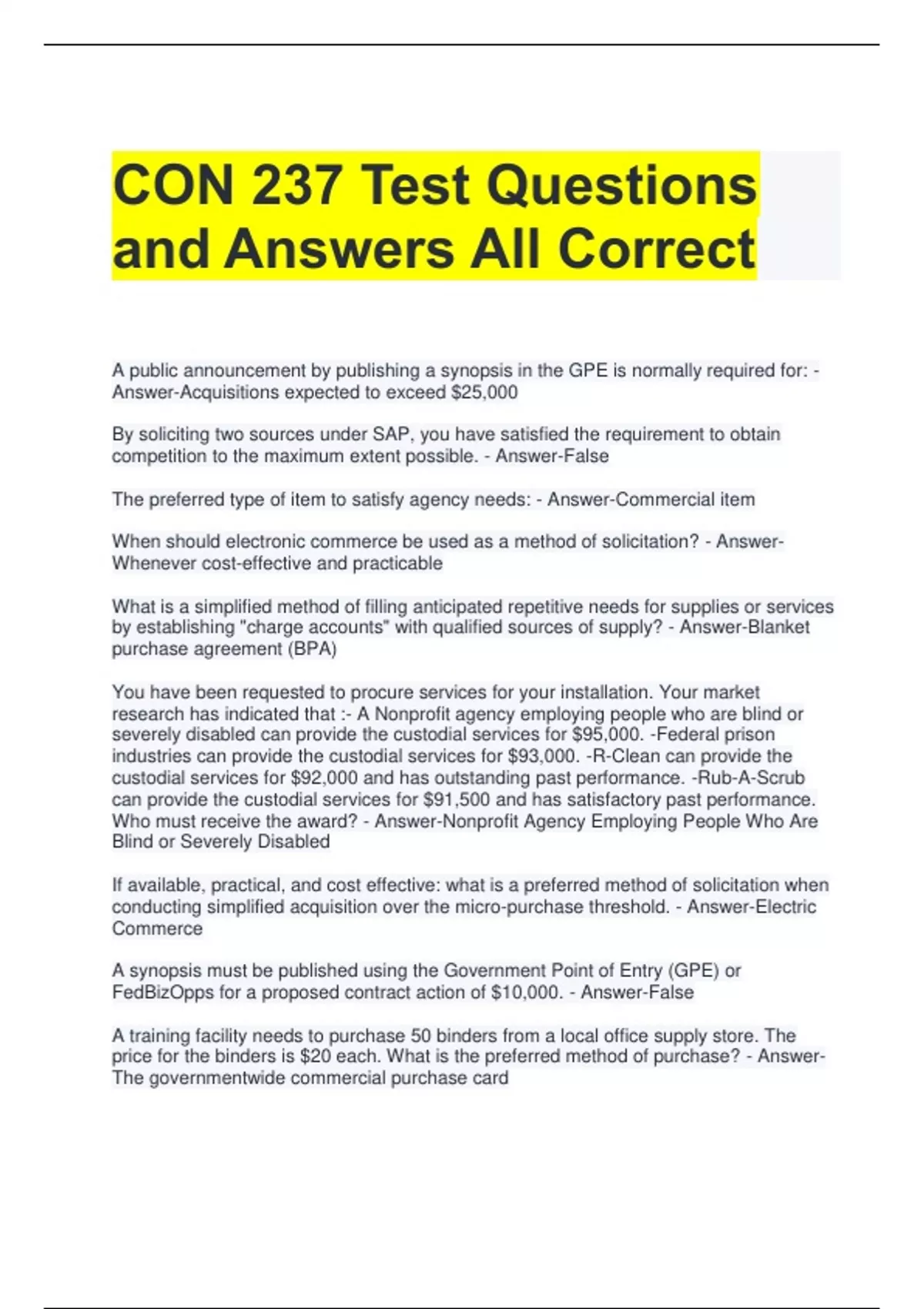 CON 237 Test Questions and Answers All Correct A public announcement by publishing a synopsis in the GPE is normally required for: - Answer-Acquisitions expected to exceed $25,000 By soliciting two sources under SAP, you have satisfied the requirement to obtain competition to the maximum extent possible. - Answer-False The preferred type of item to satisfy agency needs: - Answer-Commercial item When should electronic commerce be used as a method of solicitation? - AnswerWhenever cost-effective and practicable What is a simplified method of filling anticipated repetitive needs for supplies or services by establishing "charge accounts" with qualified sources of supply? - Answer-Blanket purchase agreement (BPA) You have been requested to procure services for your installation. Your market research has indicated that :- A Nonprofit agency employing people who are blind or severely disabled can provide the custodial services for $95,000. -Federal prison industries can provide the custodial services for $93,000. -R-Clean can provide the custodial services for $92,000 and has outstanding past performance. -Rub-A-Scrub can provide the custodial services for $91,500 and has satisfactory past performance. Who must receive the award? - Answer-Nonprofit Agency Employing People Who Are Blind or Severely Disabled If available, practical, and cost effective: what is a preferred method of solicitation when conducting simplified acquisition over the micro-purchase threshold. - Answer-Electric Commerce A synopsis must be published using the Government Point of Entry (GPE) or FedBizOpps for a proposed contract action of $10,000. - Answer-False A training facility needs to purchase 50 binders from a local office supply store. The price for the binders is $20 each. What is the preferred method of purchase? - AnswerThe governmentwide commercial purchase card Acquisitions for supplies and services exceeding $10,000, but not exceeding $250,000, are automatically reserved exclusively for small business concerns unless the contracting officer: - Answer-Determines that they will be unable to obtain two or more offer from small businesses that are competitive in terms of market... A public announcement by publishing a synopsis in the GPE is normally required for: - Answer-Acquisitions not expected to exceed the micro-purchase threshold