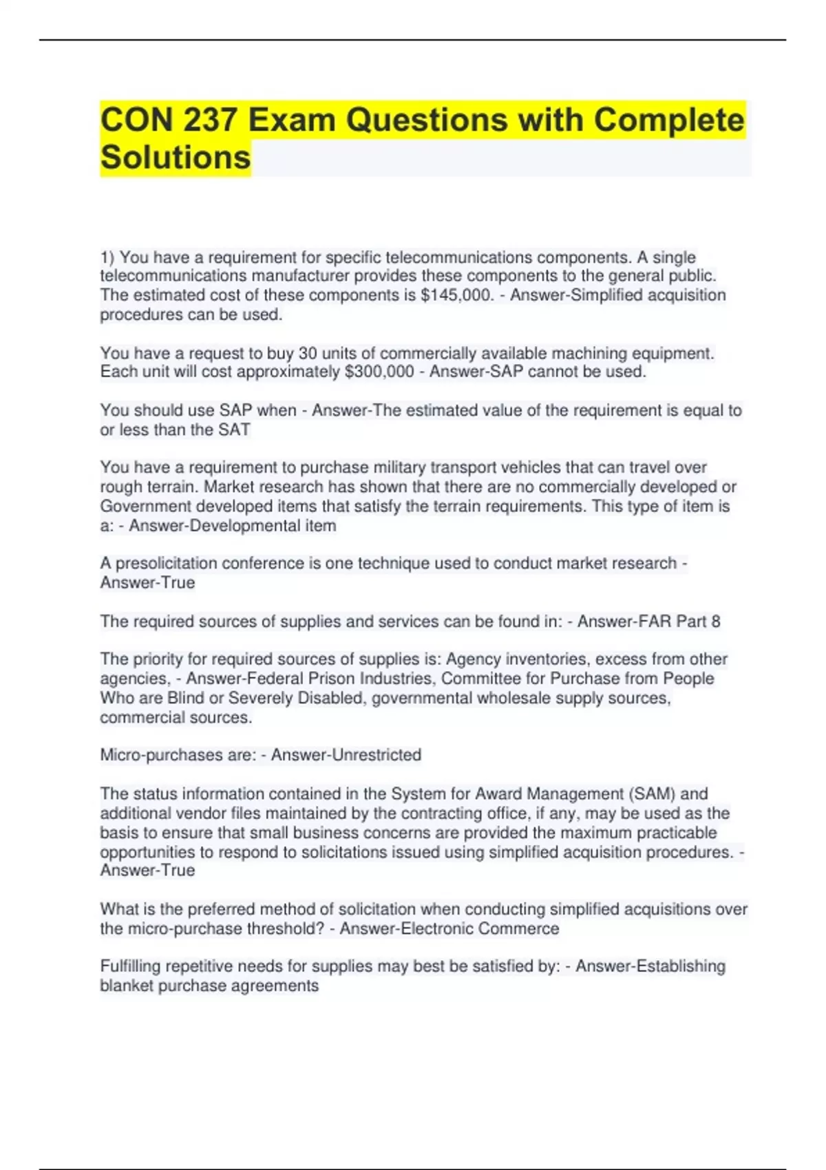 CON 237 Exam Questions with Complete Solutions 1) You have a requirement for specific telecommunications components. A single telecommunications manufacturer provides these components to the general public. The estimated cost of these components is $145,000. - Answer-Simplified acquisition procedures can be used. You have a request to buy 30 units of commercially available machining equipment. Each unit will cost approximately $300,000 - Answer-SAP cannot be used. You should use SAP when - Answer-The estimated value of the requirement is equal to or less than the SAT You have a requirement to purchase military transport vehicles that can travel over rough terrain. Market research has shown that there are no commercially developed or Government developed items that satisfy the terrain requirements. This type of item is a: - Answer-Developmental item A presolicitation conference is one technique used to conduct market research - Answer-True The required sources of supplies and services can be found in: - Answer-FAR Part 8 The priority for required sources of supplies is: Agency inventories, excess from other agencies, - Answer-Federal Prison Industries, Committee for Purchase from People Who are Blind or Severely Disabled, governmental wholesale supply sources, commercial sources. Micro-purchases are: - Answer-Unrestricted The status information contained in the System for Award Management (SAM) and additional vendor files maintained by the contracting office, if any, may be used as the basis to ensure that small business concerns are provided the maximum practicable opportunities to respond to solicitations issued using simplified acquisition procedures. - Answer-True What is the preferred method of solicitation when conducting simplified acquisitions over the micro-purchase threshold? - Answer-Electronic Commerce Fulfilling repetitive needs for supplies may best be satisfied by: - Answer-Establishing blanket purchase agreements