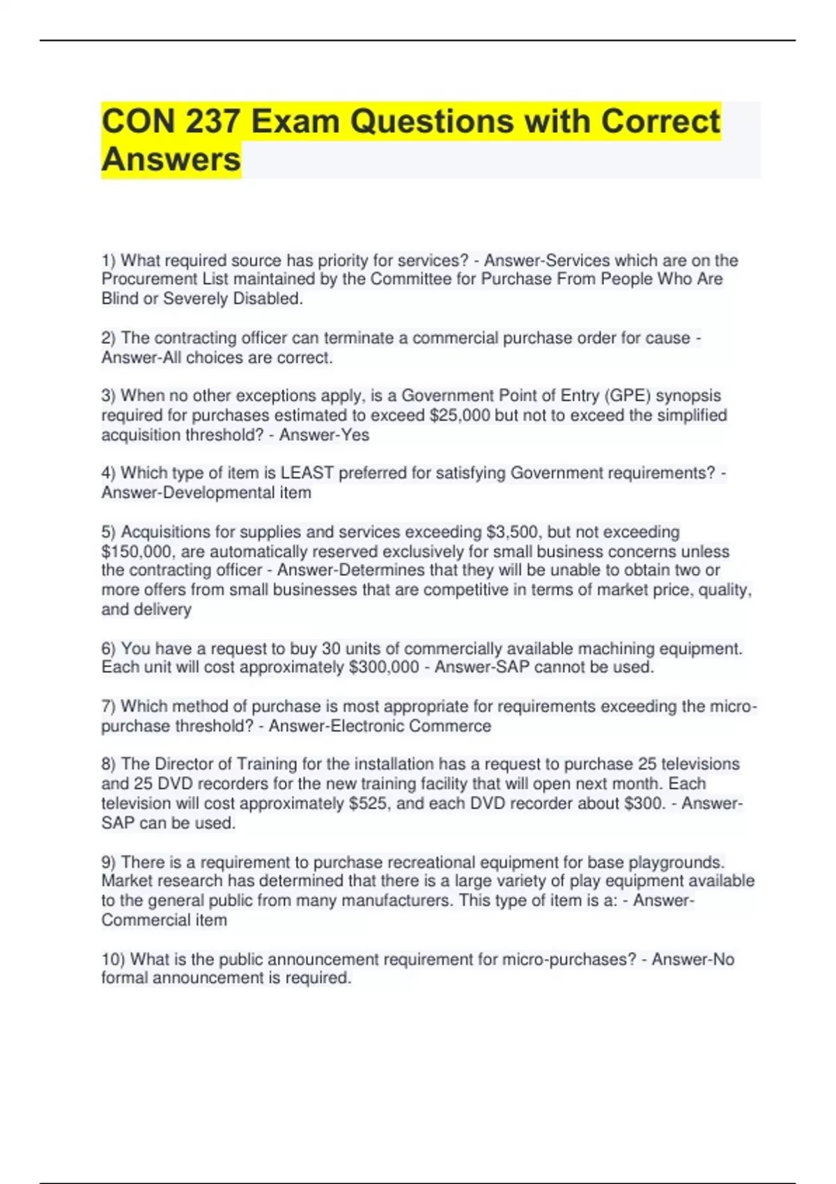 CON 237 Exam Questions with Correct Answers 1) What required source has priority for services? - Answer-Services which are on the Procurement List maintained by the Committee for Purchase From People Who Are Blind or Severely Disabled. 2) The contracting officer can terminate a commercial purchase order for cause - Answer-All choices are correct. 3) When no other exceptions apply, is a Government Point of Entry (GPE) synopsis required for purchases estimated to exceed $25,000 but not to exceed the simplified acquisition threshold? - Answer-Yes 4) Which type of item is LEAST preferred for satisfying Government requirements? - Answer-Developmental item 5) Acquisitions for supplies and services exceeding $3,500, but not exceeding $150,000, are automatically reserved exclusively for small business concerns unless the contracting officer - Answer-Determines that they will be unable to obtain two or more offers from small businesses that are competitive in terms of market price, quality, and delivery 6) You have a request to buy 30 units of commercially available machining equipment. Each unit will cost approximately $300,000 - Answer-SAP cannot be used. 7) Which method of purchase is most appropriate for requirements exceeding the micropurchase threshold? - Answer-Electronic Commerce 8) The Director of Training for the installation has a request to purchase 25 televisions and 25 DVD recorders for the new training facility that will open next month. Each television will cost approximately $525, and each DVD recorder about $300. - AnswerSAP can be used. 9) There is a requirement to purchase recreational equipment for base playgrounds. Market research has determined that there is a large variety of play equipment available to the general public from many manufacturers. This type of item is a: - AnswerCommercial item 10) What is the public announcement requirement for micro-purchases? - Answer-No formal announcement is required.
