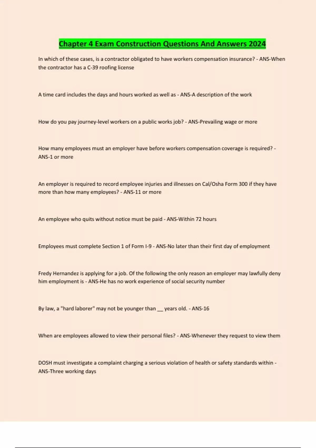 Chapter 4 Exam Construction Questions And Answers 2024 In which of these cases, is a contractor obligated to have workers compensation insurance? - ANS-When the contractor has a C-39 roofing license A time card includes the days and hours worked as well as - ANS-A description of the work How do you pay journey-level workers on a public works job? - ANS-Prevailing wage or more How many employees must an employer have before workers compensation coverage is required? - ANS-1 or more An employer is required to record employee injuries and illnesses on Cal/Osha Form 300 if they have more than how many employees? - ANS-11 or more An employee who quits without notice must be paid - ANS-Within 72 hours Employees must complete Section 1 of Form I-9 - ANS-No later than their first day of employment Fredy Hernandez is applying for a job. Of the following the only reason an employer may lawfully deny him employment is - ANS-He has no work experience of social security number By law, a "hard laborer" may not be younger than __ years old. - ANS-16 When are employees allowed to view their personal files? - ANS-Whenever they request to view them DOSH must investigate a complaint charging a serious violation of health or safety standards within - ANS-T