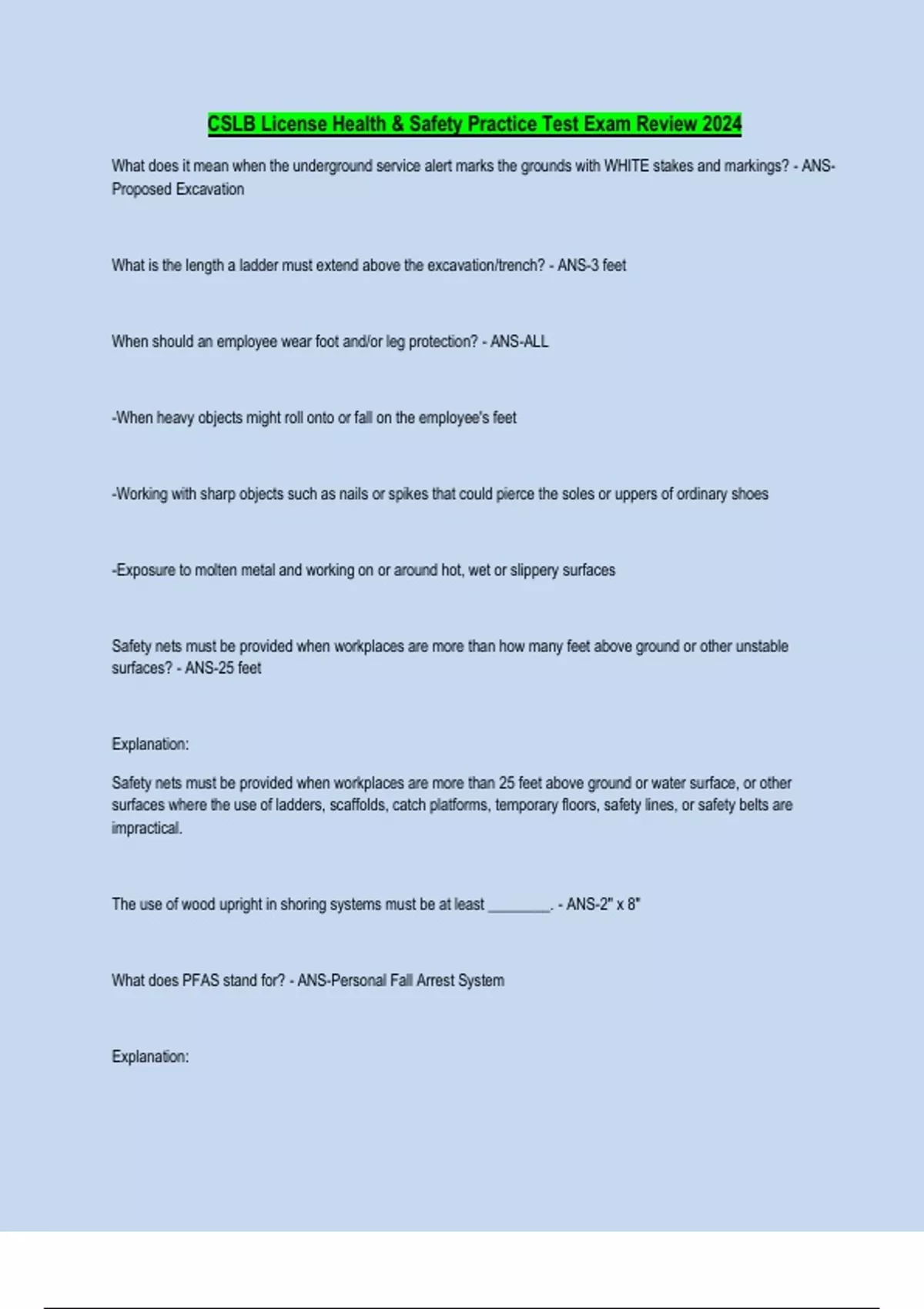 CSLB License Health & Safety Practice Test Exam Review 2024 What does it mean when the underground service alert marks the grounds with WHITE stakes and markings? - ANSProposed Excavation What is the length a ladder must extend above the excavation/trench? - ANS-3 feet When should an employee wear foot and/or leg protection? - ANS-ALL -When heavy objects might roll onto or fall on the employee's feet -Working with sharp objects such as nails or spikes that could pierce the soles or uppers of ordinary shoes -Exposure to molten metal and working on or around hot, wet or slippery surfaces Safety nets must be provided when workplaces are more than how many feet above ground or other unstable surfaces? - ANS-25 feet Explanation: Safety nets must be provided when workplaces are more than 25 feet above ground or water surface, or other surfaces where the use of ladders, scaffolds, catch platforms, temporary floors, safety lines, or safety belts are impractical. The use of wood upright in shoring systems must be at least ________. - ANS-2" x 8" What does PFAS stand for? - ANS-Personal Fall Arrest System Explanation: A PFAS is designed to arrest (stop) a worker during a fall from a working level. It consists of an anchorage, connectors, a body belt or body harness, and may include a lanyard, deceleration device, lifeline, or suitable combinations of the above. Which of the following is considered PPE? - ANS-Face shields Explanation: PPE is Personal Protective Equipment. It is meant to be worn to minimize exposure to a variety of hazards. PPE includes gloves, foot and eye protection, protective hearing devices, hard hats, respirators and full body suits. If you do not call the underground service alert intentionally, you will be subject to what penalties? - ANS-Up to $50,000 The NEC and OSHA specify that particular flexible cords be used in construction settings. Where can a flexible cord be used? - ANS-ALL -Elevator cables and wiring of cranes and hoists -Prevention of noise -With appliances where fastening and mechanical connections are designed to permit removal for maintenance or repair Explanation: Flexible cords must be connected to devices and to fittings so as to prevent tension at joints and terminal screws. Flexible cords may be damaged on the job by sharp objects and electrical conductors can be exposed. Flexible cords should not be used where frequent inspections are impractical. They should not be run through walls, ceilings, doorways, windows or hidden areas like conduits or other raceways. A certification is required for operating cranes with a rated capacity of at least how many tons? - ANS...