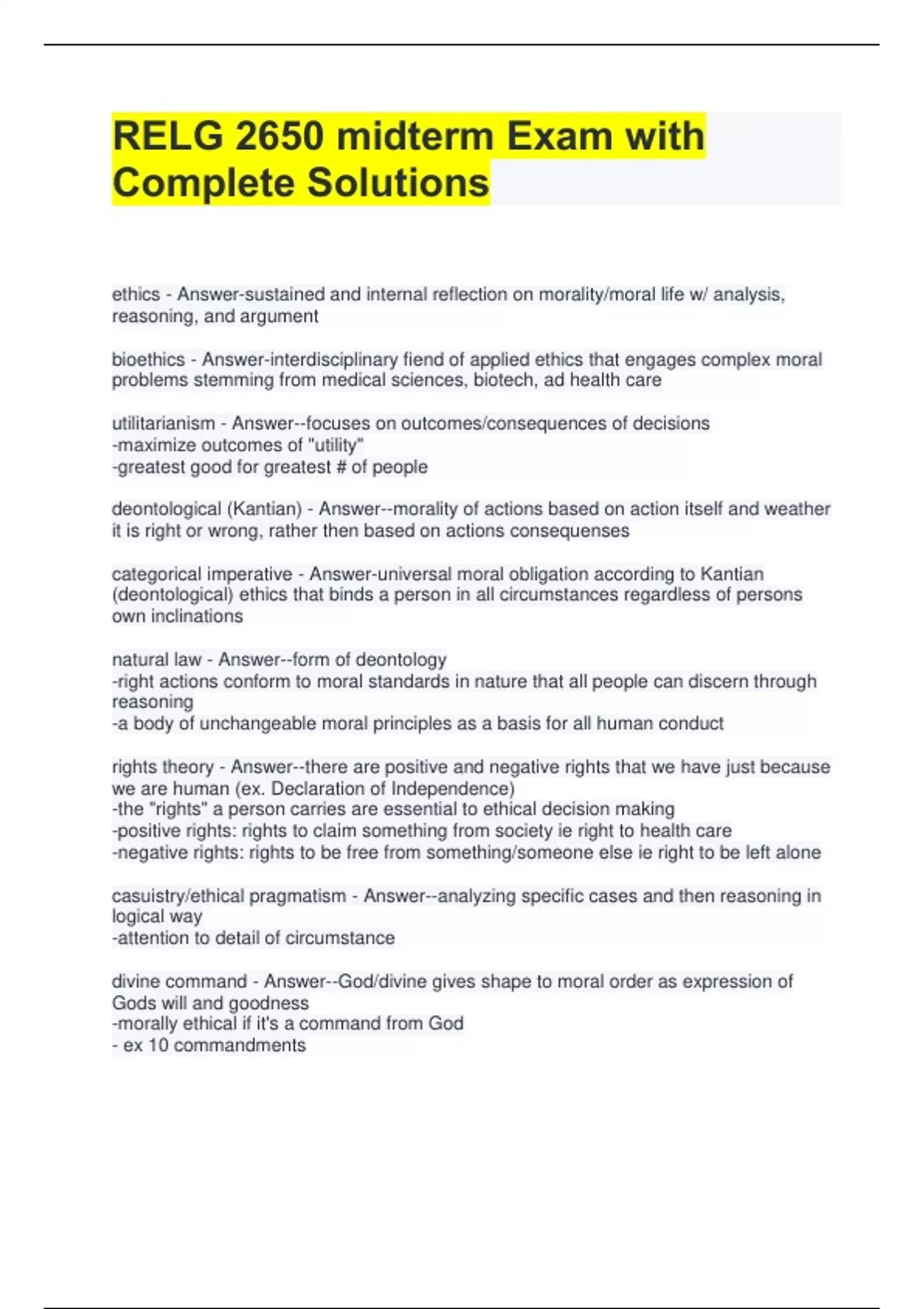 RELG 2650 midterm Exam with Complete Solutions ethics - Answer-sustained and internal reflection on morality/moral life w/ analysis, reasoning, and argument bioethics - Answer-interdisciplinary fiend of applied ethics that engages complex moral problems stemming from medical sciences, biotech, ad health care utilitarianism - Answer--focuses on outcomes/consequences of decisions -maximize outcomes of "utility" -greatest good for greatest # of people deontological (Kantian) - Answer--morality of actions based on action itself and weather it is right or wrong, rather then based on actions consequenses categorical imperative - Answer-universal moral obligation according to Kantian (deontological) ethics that binds a person in all circumstances regardless of persons own inclinations natural law - Answer--form of deontology -right actions conform to moral standards in nature that all people can discern through reasoning -a body of unchangeable moral principles as a basis for all human conduct rights theory - Answer--there are positive and negative rights that we have just because we are human (ex. Declaration of Independence) -the "rights" a person carries are essential to ethical decision making -positive rights: rights to claim something from society ie right to health care -negative rights: rights to be free from something/someone else ie right to be left alone casuistry/ethical pragmatism - Answer--analyzing specific cases and then reasoning in logical way -attention to detail of circumstance divine command - Answer--God/divine gives shape to moral order as expression of Gods will and goodness -morally ethical if it's a command from God - ex 10 commandments revelation - Answer-divine disclosure to man of something relating to human existence of the world covenant - Answer-both have responsibilities, an agreement between God and his people prophets - Answer-there to call people back to God and tell them and tell them how to follow the covenant in the future Torah - Answer--first of 5 books of bible- "law" -says little about medical care Talmud - Answer--compilation of Mishna combined with Rabbinic commentary and decisions -collection of Jewish law and tradition -rabbinic commentary and decisions halakha - Answer-Jewish law as applied to Jewish living tikkun olam - Answer-respect for life is fundamental divine body ownership - Answer-body belongs to God, duty to care and not harm -idea in Judaism. We are borrowing our bodies from God and soul is integrated into the person. Body returns to God when we die... OBLIGATED to maintain health and relieve pain. Jesus of Nazareth - Answer--a teacher and prophet born in Bethlehem and active in Nazareth -Gods' revelation w him (crucified and resurrected from dead). New covenant given to the community that changes the relationship of Jews to Torah by creation of new testament. Ex: circumcision not required by the bible now.