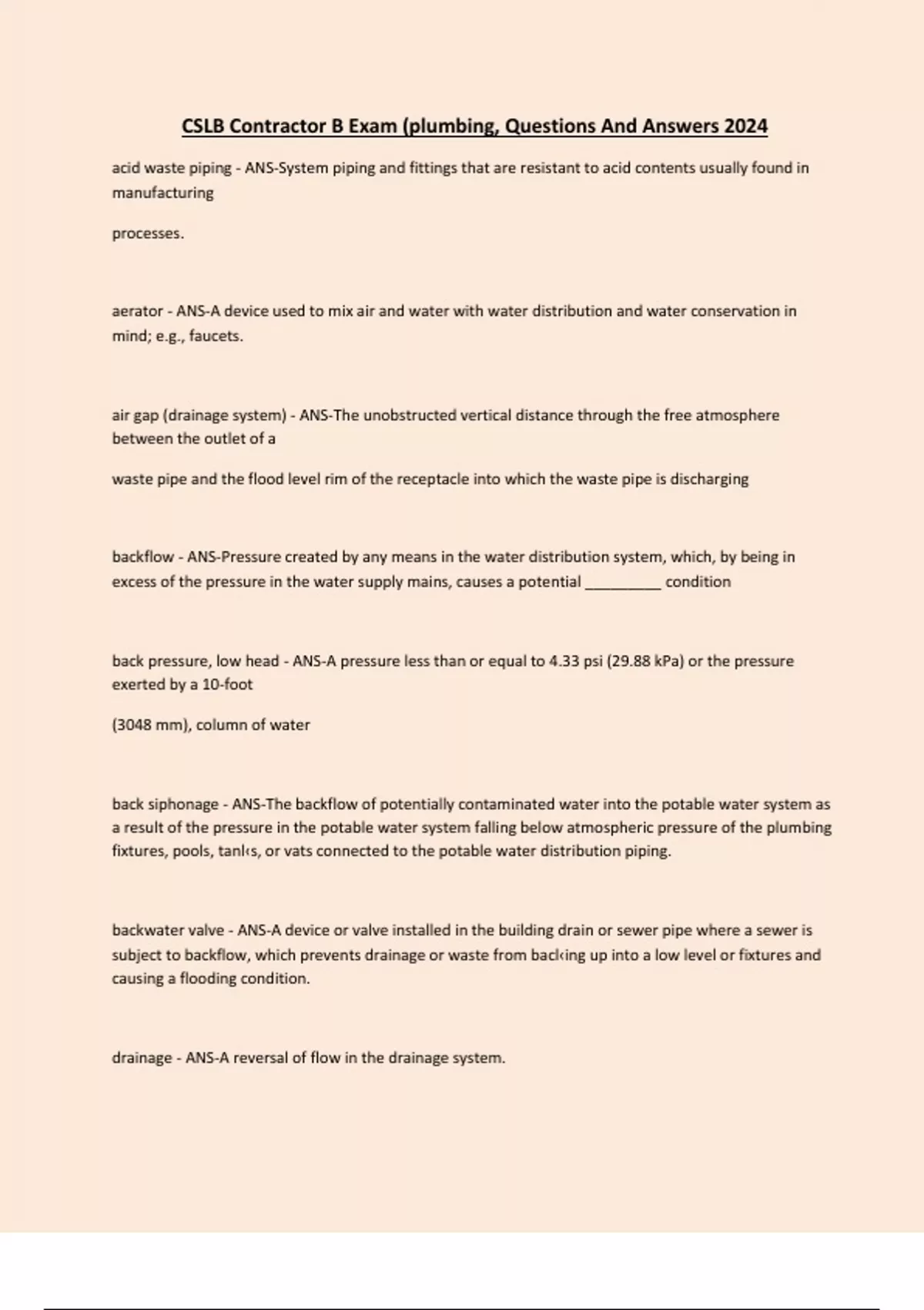 CSLB Contractor B Exam (plumbing, Questions And Answers 2024 acid waste piping - ANS-System piping and fittings that are resistant to acid contents usually found in manufacturing processes. aerator - ANS-A device used to mix air and water with water distribution and water conservation in mind; e.g., faucets. air gap (drainage system) - ANS-The unobstructed vertical distance through the free atmosphere between the outlet of a waste pipe and the flood level rim of the receptacle into which the waste pipe is discharging backflow - ANS-Pressure created by any means in the water distribution system, which, by being in excess of the pressure in the water supply mains, causes a potential _________ condition back pressure, low head - ANS-A pressure less than or equal to 4.33 psi (29.88 kPa) or the pressure exerted by a 10-foot (3048 mm), column of water back siphonage - ANS-The backflow of potentially contaminated water into the potable water system as a result of the pressure in the potable water system falling below atmospheric pressure of the plumbing fixtures, pools, tanl‹s, or vats connected to the potable water distribution piping. backwater valve - ANS-A device or valve installed in the building drain or sewer pipe where a sewer is subject to backflow, which prevents drainage or waste from bacl‹ing up into a low level or fixtures and causing a flooding condition. drainage - ANS...