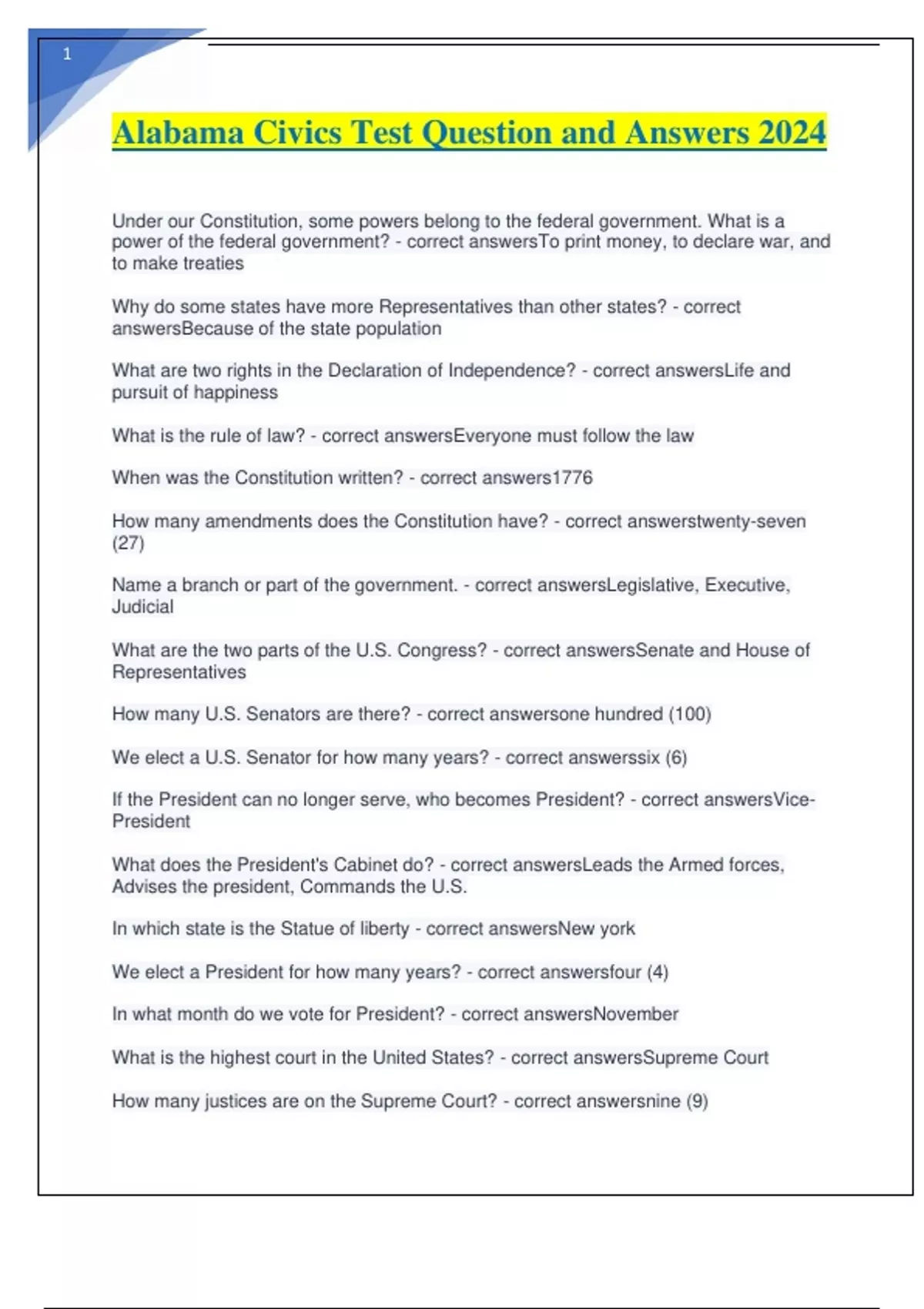 Alabama Civics Test Question and Answers 2024