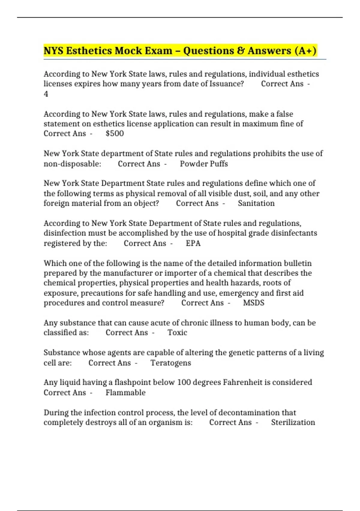 NYS Esthetics Mock Exam – Questions & Answers (A+)