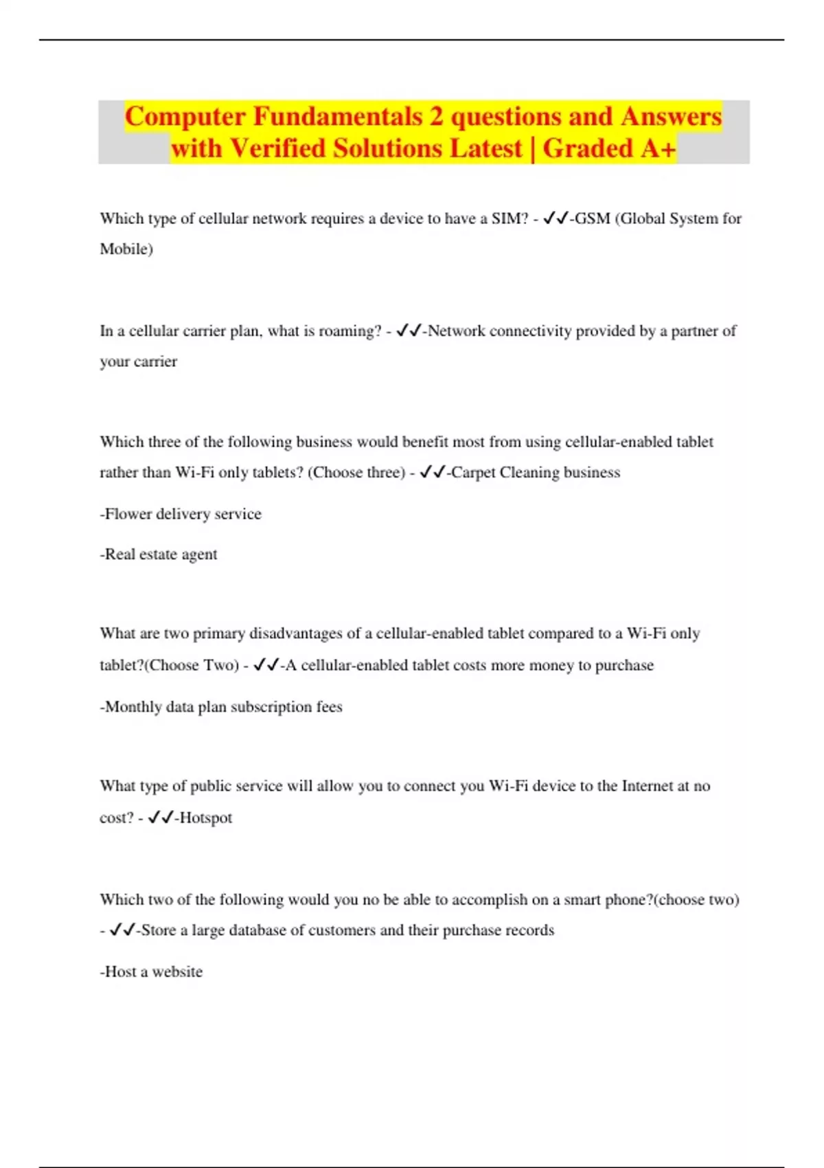 Which type of cellular network requires a device to have a SIM? - -GSM (Global System for Mobile) In a cellular carrier plan, what is roaming? - -Network connectivity provided by a partner of your carrier Which three of the following business would benefit most from using cellular-enabled tablet rather than Wi-Fi only tablets? (Choose three) - -Carpet Cleaning business -Flower delivery service -Real estate agent What are two primary disadvantages of a cellular-enabled tablet compared to a Wi-Fi only tablet?(Choose Two) - -A cellular-enabled tablet costs more money to purchase -Monthly data plan subscription fees What type of public service will allow you to connect you Wi-Fi device to the Internet at no cost? - -Hotspot Which two of the following would you no be able to accomplish on a smart phone?(choose two) - -Store a large database of customers and their purchase records