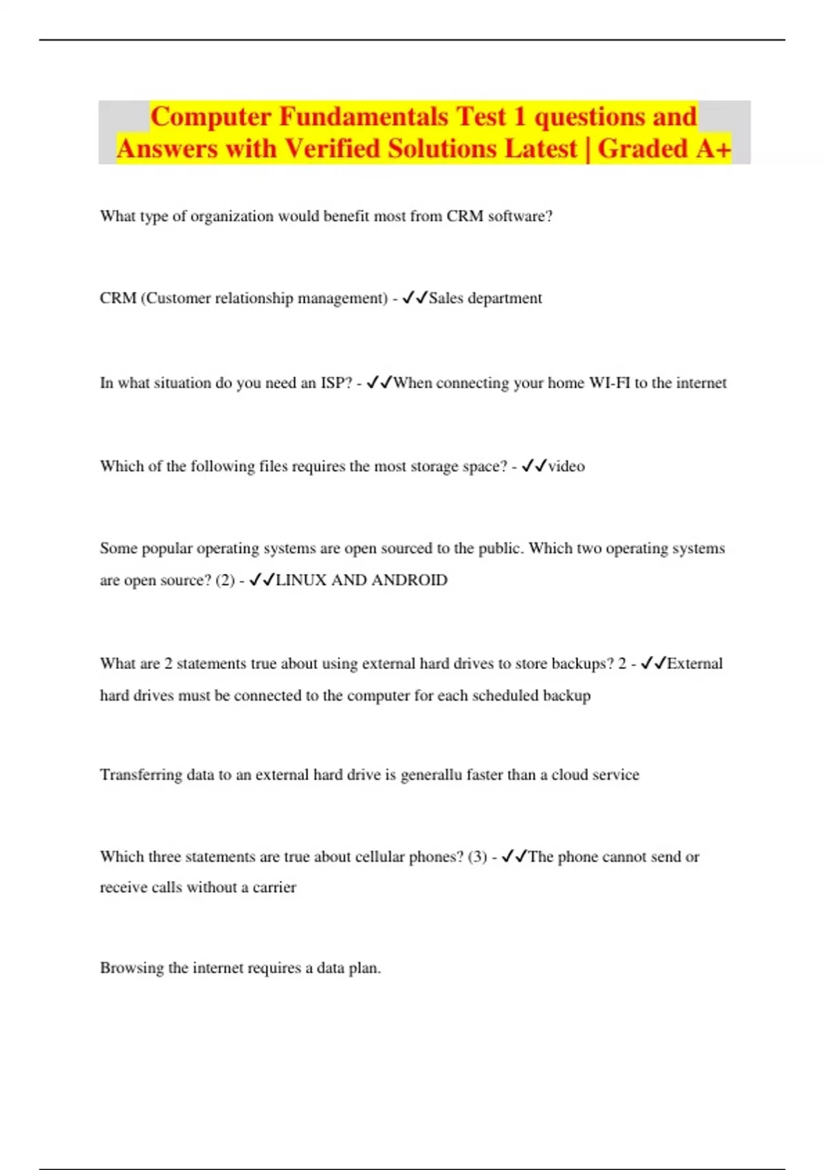 What type of organization would benefit most from CRM software? CRM (Customer relationship management) - Sales department In what situation do you need an ISP? - When connecting your home WI-FI to the internet Which of the following files requires the most storage space? - video Some popular operating systems are open sourced to the public. Which two operating systems are open source? (2) - LINUX AND ANDROID What are 2 statements true about using external hard drives to store backups? 2 - External hard drives must be connected to the computer for each scheduled backup Transferring data to an external hard drive is generallu faster than a cloud service Which three statements are true about cellular phones? (3) - The phone cannot send or receive calls without a carrier Browsing the internet requires a data plan