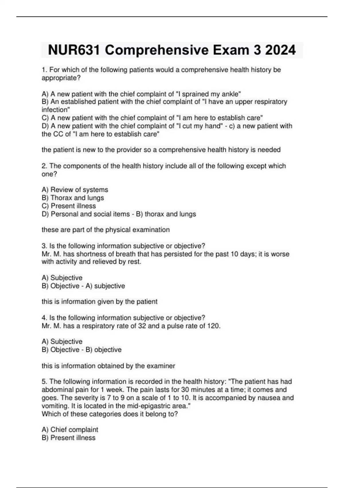 1. For which of the following patients would a comprehensive health history be appropriate? A) A new patient with the chief complaint of "I sprained my ankle" B) An established patient with the chief complaint of "I have an upper respiratory infection" C) A new patient with the chief complaint of "I am here to establish care" D) A new patient with the chief complaint of "I cut my hand" - c) a new patient with the CC of "I am here to establish care" the patient is new to the provider so a comprehensive health history is needed 2. The components of the health history include all of the following except which one? A) Review of systems B) Thorax and lungs C) Present illness D) Personal and social items - B) thorax and lungs these are part of the physical examination 3. Is the following information subjective or objective? Mr. M. has shortness of breath that has persisted for the past 10 days; it is worse with activity and relieved by rest. A) Subjective B) Objective - A) subjective this is information given by the patient 4. Is the following information subjective or objective? Mr. M. has a respiratory rate of 32 and a pulse rate of 120. A) Subjective B) Objective - B) objective this is information obtained by the examiner 5. The following information is recorded in the health history: "The patient has had abdominal pain for 1 week. The pain lasts for 30 minutes at a time; it comes and goes. The severity is 7 to 9 on a scale of 1 to 10. It is accompanied by nausea and vomiting. It is located in the mid-epigastric area." Which of these categories does it belong to? A) Chief complaint B) Present illness C) Personal and social history D) Review of systems - B) Present illness HPI 6. The following information is recorded in the health history: "The patient completed 8th grade. He currently lives with his wife and two children. He works on old cars on the weekend. He works in a glass factory during the week." Which category does it belong to? A) Chief complaint