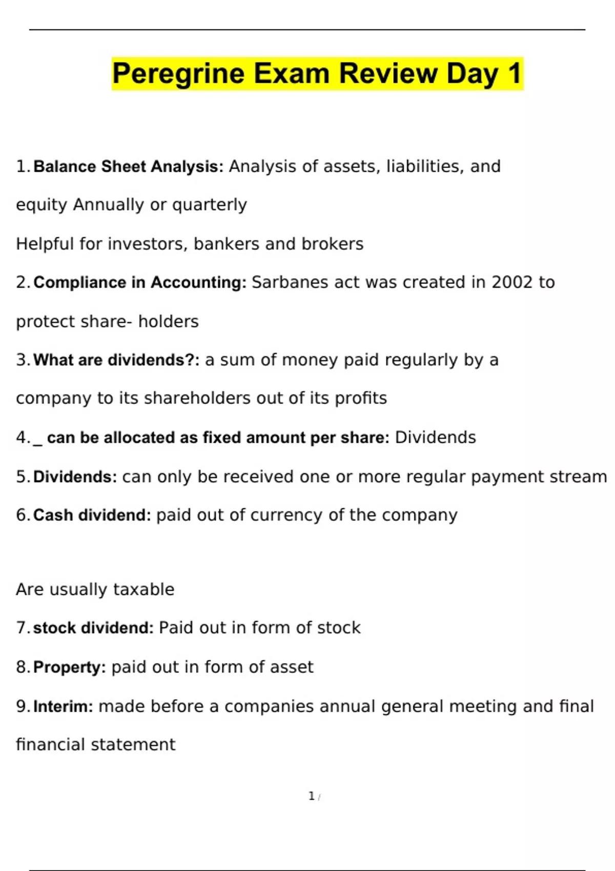 Peregrine Exam Review Day 1 Questions and Verified Answers (2024 / 2025)/ A+ GRADE.1. Balance Sheet Analysis: Analysis of assets, liabilities, and equity Annually or quarterly Helpful for investors, bankers and brokers 2. Compliance in Accounting: Sarbanes act was created in 2002 to protect share- holders 3. What are dividends?: a sum of money paid regularly by a company to its shareholders out of its profits 4. _ can be allocated as fixed amount per share: Dividends 5. Dividends: can only be received one or more regular payment stream 6. Cash dividend: paid out of currency of the company Are usually taxable 7. stock dividend: Paid out in form of stock 8. Property: paid out in form of asset 9. Interim: made before a companies annual general meeting and final financial statement 10. Common stock: allows owners to vote at shareholder meetings and receive dividends 11. preffered stock: stock that gives stockholders preference in earnings and other rights 12. Growth stock: earnings grow faster than market average Dividends rarely paid Investors buy them Startup technology company likely has them