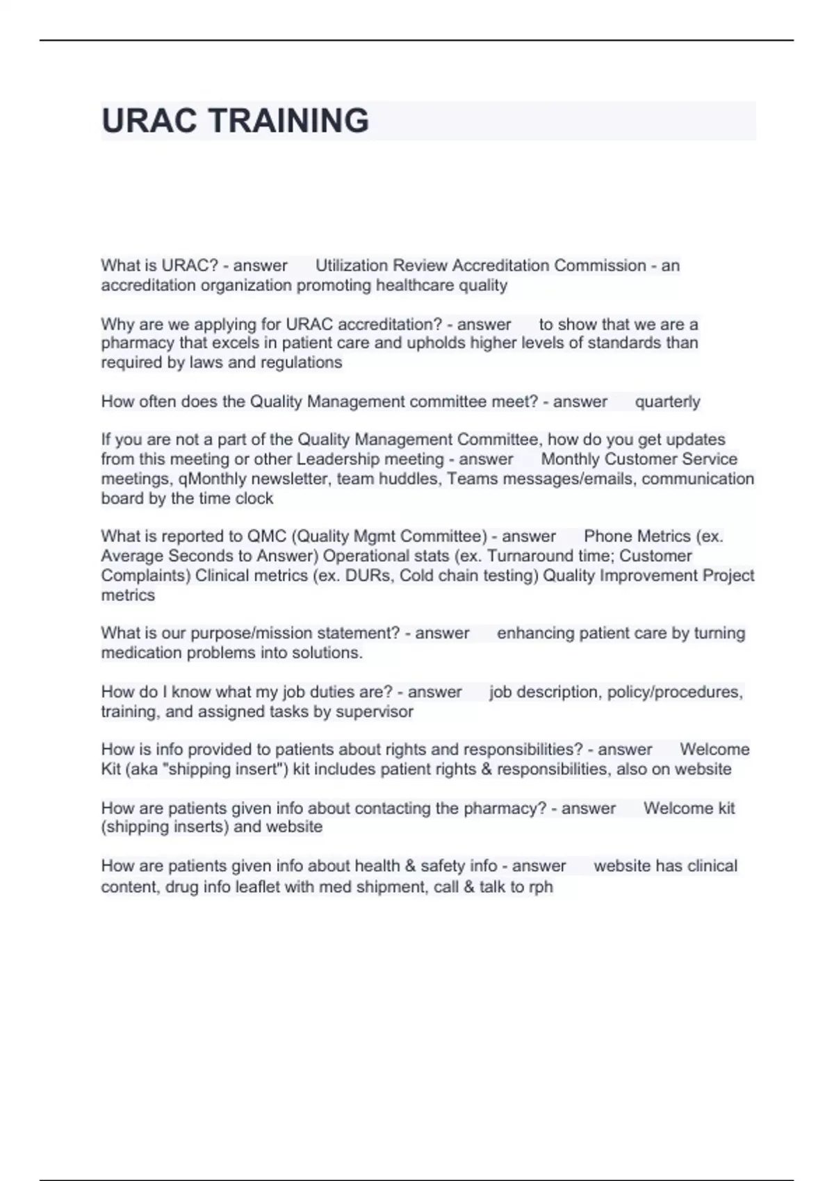 URAC TRAINING QUESTIONS AND ANSWERS 2024