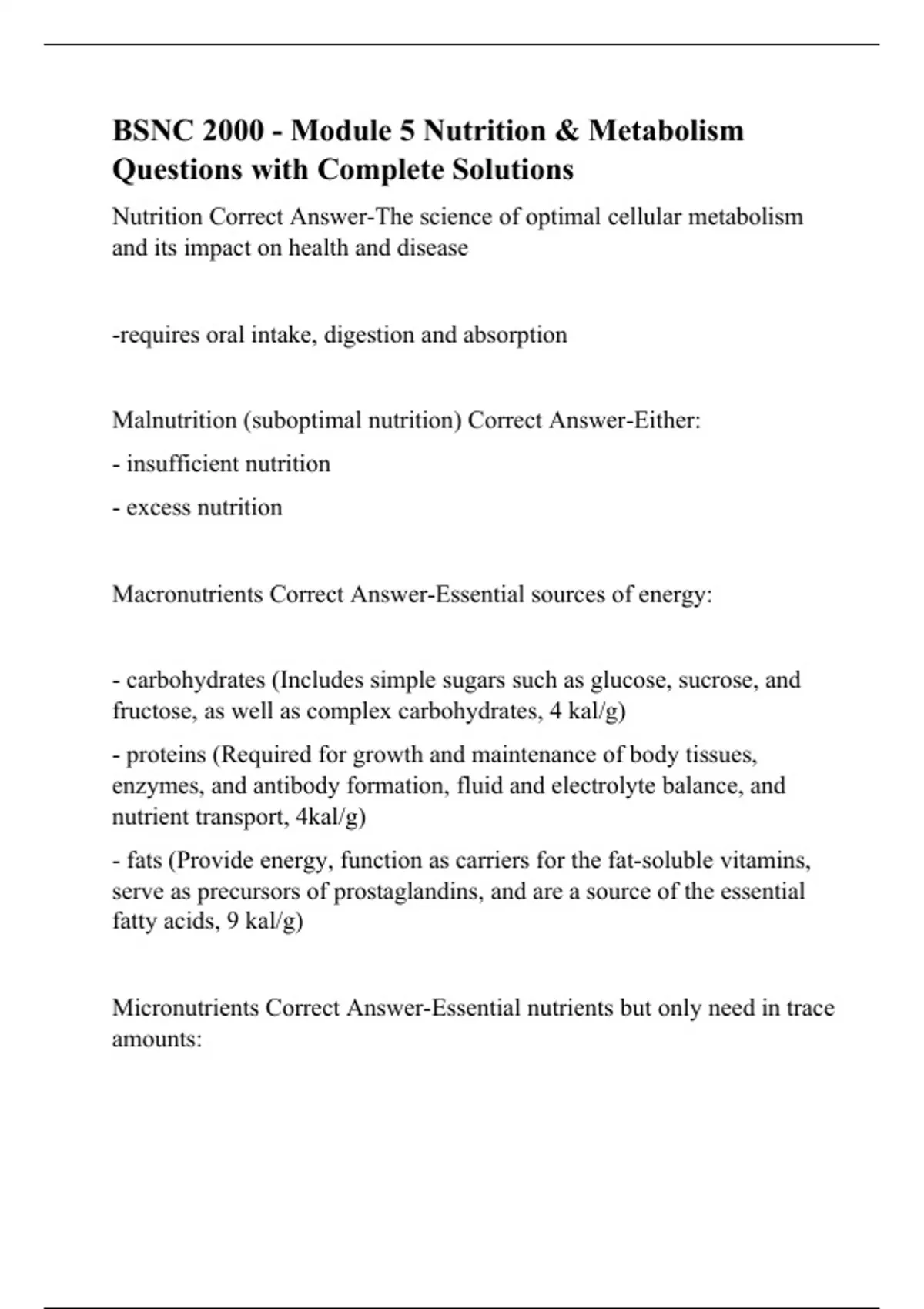 BSNC 2000 - Module 5 Nutrition & Metabolism Questions with Complete Solutions