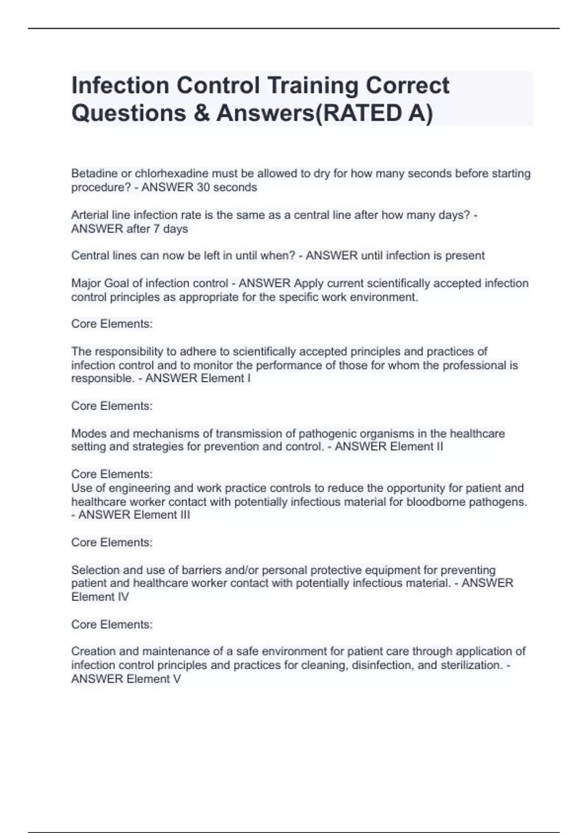 Betadine or chlorhexadine must be allowed to dry for how many seconds before starting procedure? - ANSWER 30 seconds Arterial line infection rate is the same as a central line after how many days? - ANSWER after 7 days Central lines can now be left in until when? - ANSWER until infection is present Major Goal of infection control - ANSWER Apply current scientifically accepted infection control principles as appropriate for the specific work environment. Core Elements: The responsibility to adhere to scientifically accepted principles and practices of infection control and to monitor the performance of those for whom the professional is responsible. - ANSWER Element I Core Elements: Modes and mechanisms of transmission of pathogenic organisms in the healthcare setting and strategies for prevention and control. - A
