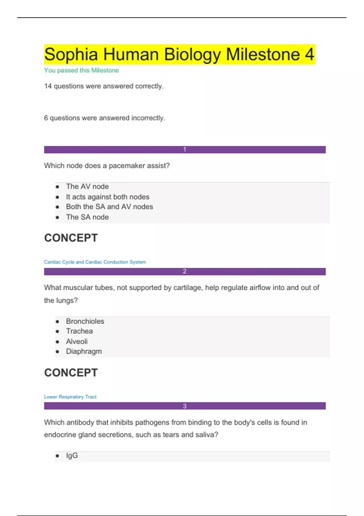 Sophia Human Biology Milestone 4 You passed this Milestone 14 questions were answered correctly. 6 questions were answered incorrectly. 1 Which node does a pacemaker assist? CONCEPT Cardiac Cycle and Cardiac Conduction System 2 What muscular tubes, not supported by cartilage, help regulate airflow into and out of the lungs? CONCEPT Lower Respiratory Tract 3 Which antibody that inhibits pathogens from binding to the body's cells is found in endocrine gland secretions, such as tears and saliva? CONCEPT Humoral Immunity 4 What is the function of the capillaries? CONCEPT Cardiovascular System 5 Monoclonal antibodies and can be used to treat certain types of cancers in a process known as immunotherapy. CONCEPT Organ Transplant and Immunotherapy 6 What are the two types of effector T-cells?