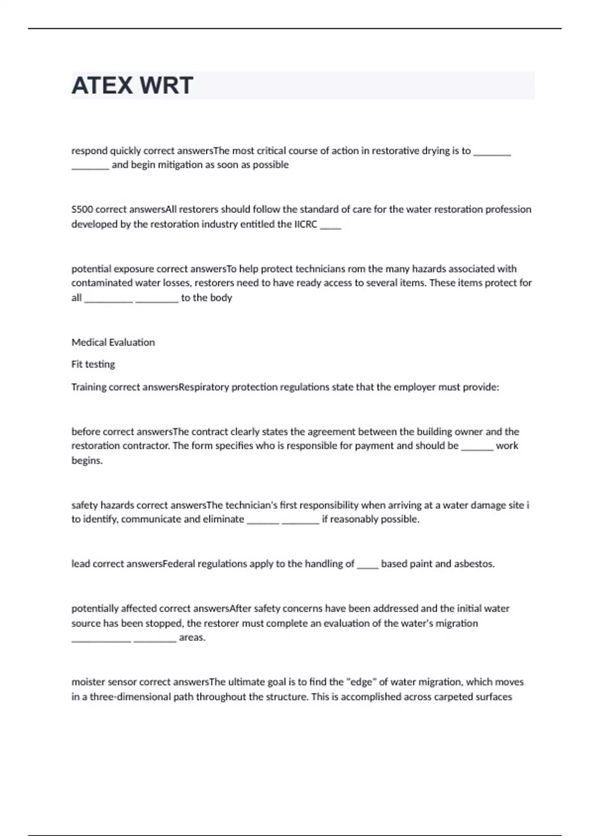 respond quickly correct answersThe most critical course of action in restorative drying is to _______ _______ and begin mitigation as soon as possible S500 correct answersAll restorers should follow the standard of care for the water restoration profession developed by the restoration industry entitled the IICRC ____ potential exposure correct answersTo help protect technicians rom the many hazards associated with contaminated water losses, restorers need to have ready access to several items. These items protect for all _________ ________ to the body Medical Evaluation Fit testing Training correct answersRespiratory protection regulations state that the employer must provide: before correct answersThe contract clearly states the agreement between the building owner and the restoration contractor. The form specifies who is responsible for payment and should be ______ work begins. safety hazards correct answersThe technician's first responsibility when arriving at a water damage site i to identify, communicate and eliminate ______ _______ if reasonably possible. lead correct answersFederal regulations apply to the handling of ____ based paint and asbestos. potentially affected correct answersAfter safety concerns have been addressed and the initial water source has been stopped, the restorer must complete an evaluation of the water's migration ___________ ________ areas. moister sensor correct answersThe ultimate goal is to find the "edge" of water migration, which moves in a three-dimensional path throughout the structure. This is accomplished across carpeted surfaces