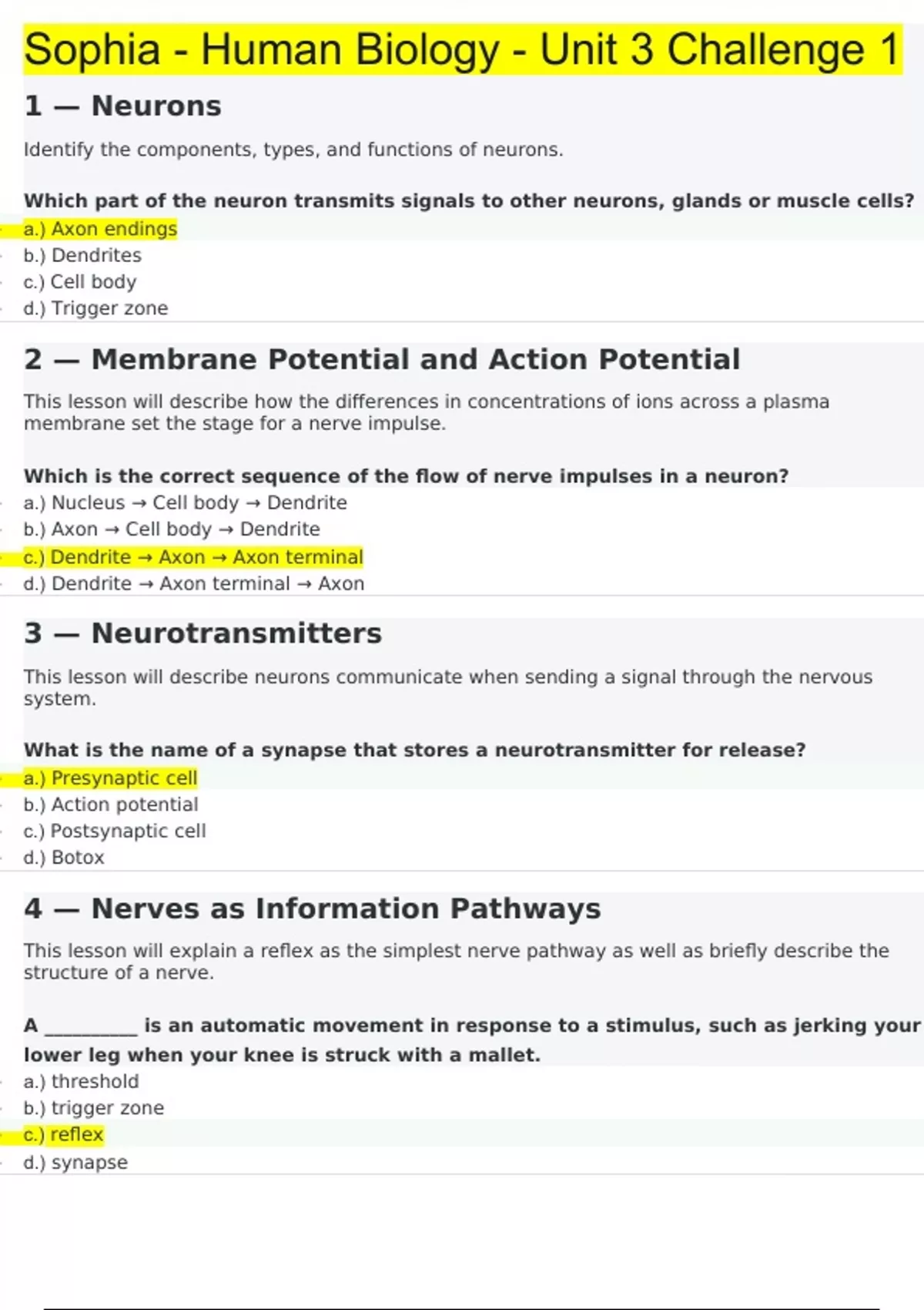 Sophia - Human Biology - Unit 3 Challenge 1 1 — Neurons Identify the components, types, and functions of neurons. Which part of the neuron transmits signals to other neurons, glands or muscle cells? • a.) Axon endings • b.) Dendrites • c.) Cell body • d.) Trigger zone 2 — Membrane Potential and Action Potential This lesson will describe how the differences in concentrations of ions across a plasma membrane set the stage for a nerve impulse. Which is the correct sequence of the flow of nerve impulses in a neuron? • a.) Nucleus → Cell body → Dendrite • b.) Axon → Cell body → Dendrite • c.) Dendrite → Axon → Axon terminal • d.) Dendrite → Axon terminal → Axon 3 — Neurotransmitters This lesson will describe neurons communicate when sending a signal through the nervous system. What is the name of a synapse that stores a neurotransmitter for release? • a.) Presynaptic cell • b.) Action potential • c.) Postsynaptic cell • d.) Botox 4 — Nerves as Information Pathways This lesson will explain a reflex as the simplest nerve pathway as well as briefly describe the structure of a nerve. A __________ is an automatic movement in response to a stimulus, such as jerking your lower leg when your knee is struck with a mallet. • a.) threshold • b.) trigger zone • c.) reflex • d.) synapse
