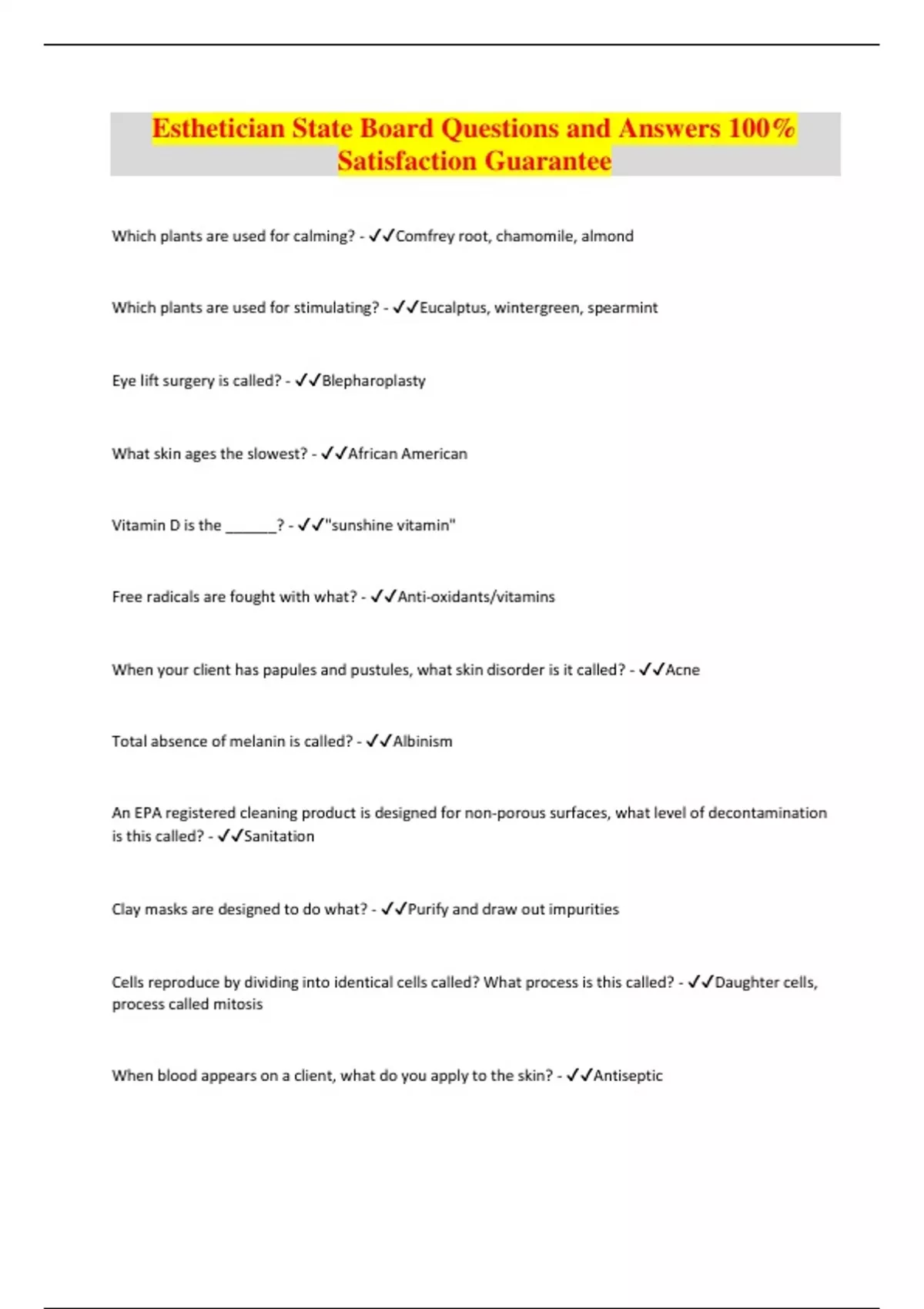Esthetician State Board Questions and Answers 100% Satisfaction Guarantee