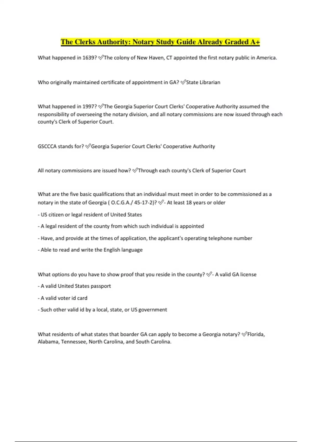 The Clerks Authority: Notary Study Guide Already Graded A+ What happened in 1639? The colony of New Haven, CT appointed the first notary public in America. Who originally maintained certificate of appointment in GA? State Librarian What happened in 1997? The Georgia Superior Court Clerks' Cooperative Authority assumed the responsibility of overseeing the notary division, and all notary commissions are now issued through each county's Clerk of Superior Court. GSCCCA stands for? Georgia Superior Court Clerks' Cooperative Authority All notary commissions are issued how? Through each county's Clerk of Superior Court What are the five basic qualifications that an individual must meet in order to be commissioned as a notary in the state of Georgia ( O.C.G.A./ 45-17-2)? - At least 18 years or older - US citizen or legal resident of United States - A legal resident of the county from which such individual is appointed - Have, and provide at the times of application, the applicant's operating telephone number - Able to read and write the English language What options do you have to show proof that you reside in the county? - A valid GA license - A valid United States passport - A valid voter id card - Such other valid id by a local, state, or US government What residents of what states that boarder GA can apply to become a Georgia notary?