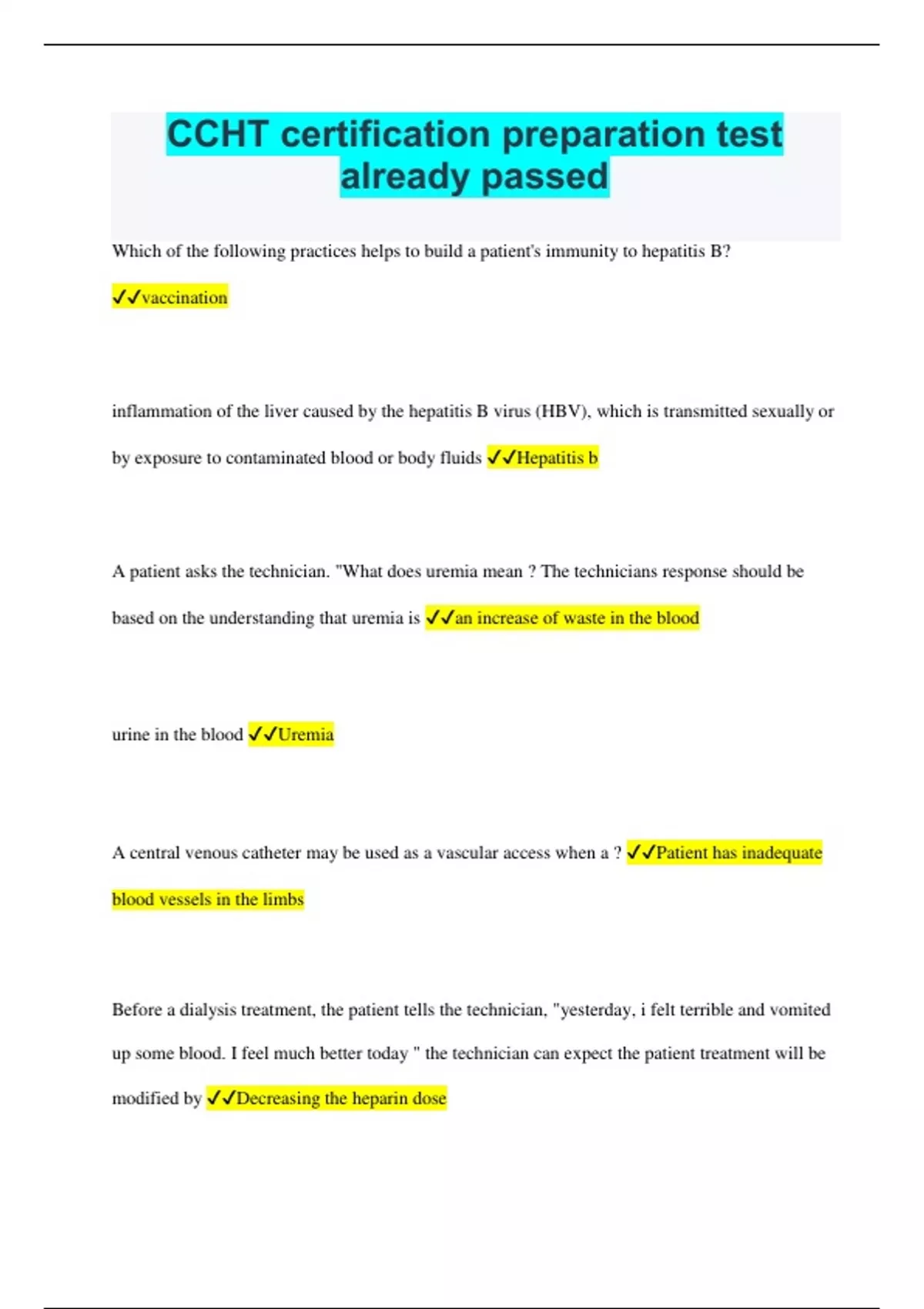 CCHT certification preparation test already passed Which of the following practices helps to build a patient's immunity to hepatitis B? vaccination inflammation of the liver caused by the hepatitis B virus (HBV), which is transmitted sexually or by exposure to contaminated blood or body fluids Hepatitis b A patient asks the technician. "What does uremia mean ? The technicians response should be based on the understanding that uremia is an increase of waste in the blood urine in the blood Uremia A central venous catheter may be used as a vascular access when a ? Patient has inadequate blood vessels in the limbs Before a dialysis treatment, the patient tells the technician, "yesterday, i felt terrible and vomited up some blood. I feel much better today " the technician can expect the patient treatment will be modified by Decreasing the heparin dose