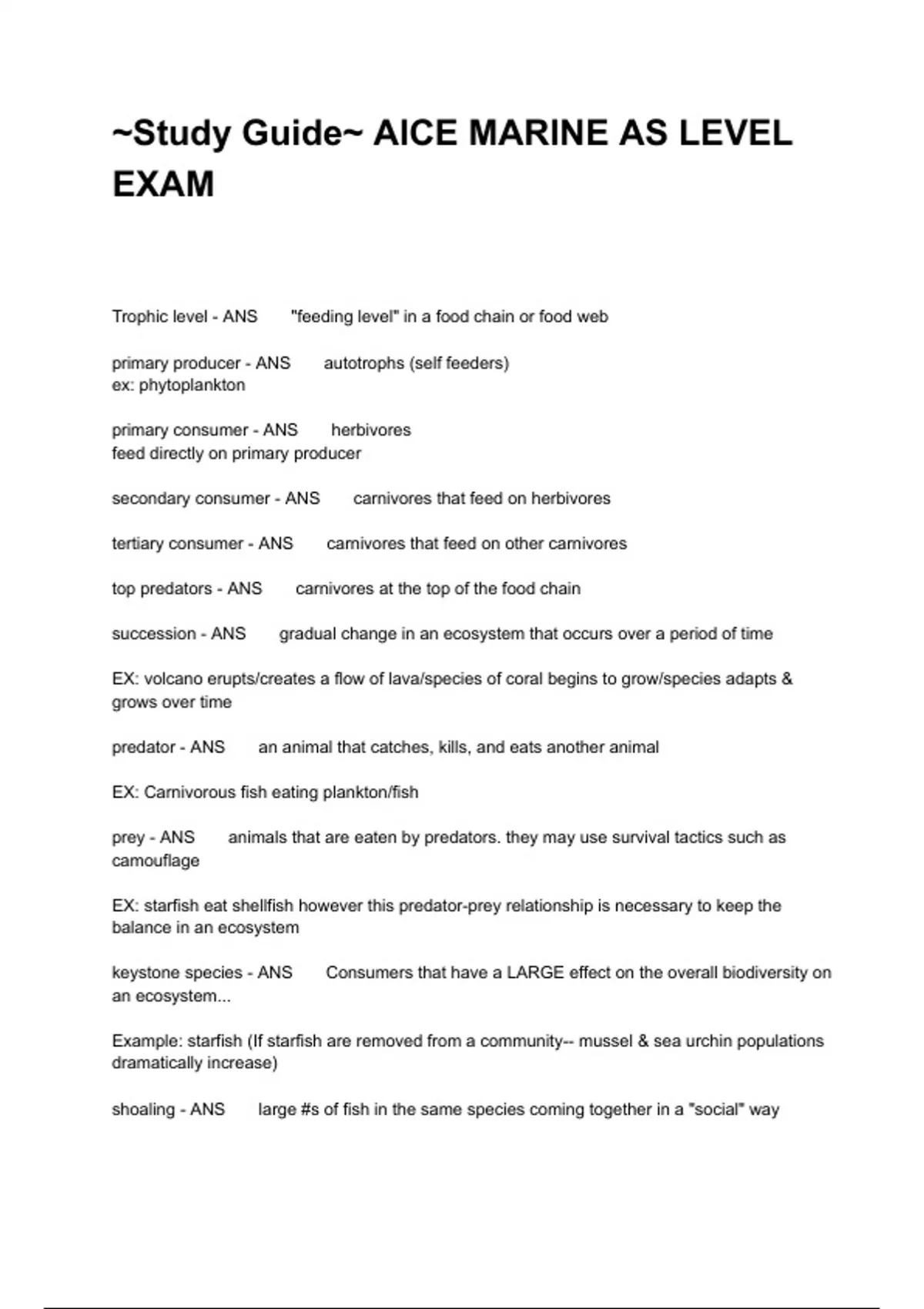 Trophic level - ANS "feeding level" in a food chain or food web primary producer - ANS autotrophs (self feeders) ex: phytoplankton primary consumer - ANS herbivores feed directly on primary producer secondary consumer - ANS carnivores that feed on herbivores tertiary consumer - ANS carnivores that feed on other carnivores top predators - ANS carnivores at the top of the food chain succession - ANS gradual change in an ecosystem that occurs over a period of time EX: volcano erupts/creates a flow of lava/species of coral begins to grow/species adapts & grows over time predator - ANS an animal that catches, kills, and eats another animal EX: Carnivorous fish eating plankton/fish prey - ANS animals that are eaten by predators. they may use survival tactics such as camouflage EX: starfish eat shellfish however this predator-prey relationship is necessary to keep the balance in an ecosystem keystone species - ANS Consumers that have a LARGE effect on the overall biodiversity on an ecosystem... Example: starfish (If starfish are removed from a community-- mussel & sea urchin populations dramatically increase) shoaling - ANS large #s of fish in the same species coming together in a "social" way shoaling advantages - ANS 1) hydrodynamic frequency 2) more eyes to seek out feed 3) more eyes to seek out predators 4) protection for predators 5) saves energy 6) amount of fish confuses predators 7) increase chance to find a mate 8) easier to reproduce population - ANS organisms of the SAME species living together community - ANS organisms of DIFFERENT species living together habitat - ANS natural environment of an organism ecosystem - ANS system of organisms and their NONLIVING environment
