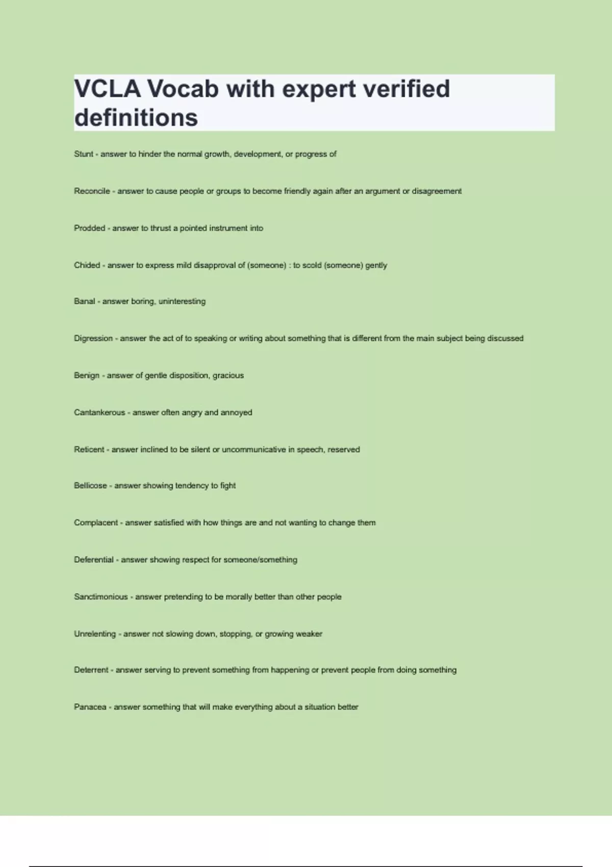 Stunt to hinder the normal growth, development, or progress of Reconcile to cause people or groups to become friendly again after an argument or disagreement Prodded to thrust a pointed instrument into Chided to express mild disapproval of (someone) : to scold (someone) gently Banal boring, uninteresting Digression the act of to speaking or writing about something that is different from the main subject being discussed Benign of gentle disposition, gracious Cantankerous often angry and annoyed Reticent inclined to be silent or uncommunicative in speech, reserved Bellicose showing tendency to fight Complacent satisfied with how things are and not wanting to change them Deferential showing respect for someone/something Sanctimonious pretending to be morally better than other people Unrelenting not slowing down, stopping, or growing weaker Deterrent serving to prevent something from happening or prevent people from doing something Panacea something that will make everything about a situation better Provocation an action or occurrence that causes someone to become angry or to begin to do something Mitigate to make (something) less severe, harmful, or painful Conducive making it easy, possible, or likely for something to happen or exist Bereft deprived or robbed of the presence of something Miscreants a person who does something that is illegal or morally wrong Anomaly something that is unusual or unexpected : something anomalous Tacit expressed or understood without being directly stated Impetuous acting or done quickly and without thought : controlled by emotion rather than thought Regal of, relating to, or suitable for a king or queen Dispel to make something end or go away Levity lack of seriousness Haughty showing the attitude of someone who thinks they are better than everyone else Impudent rude Insolent rude