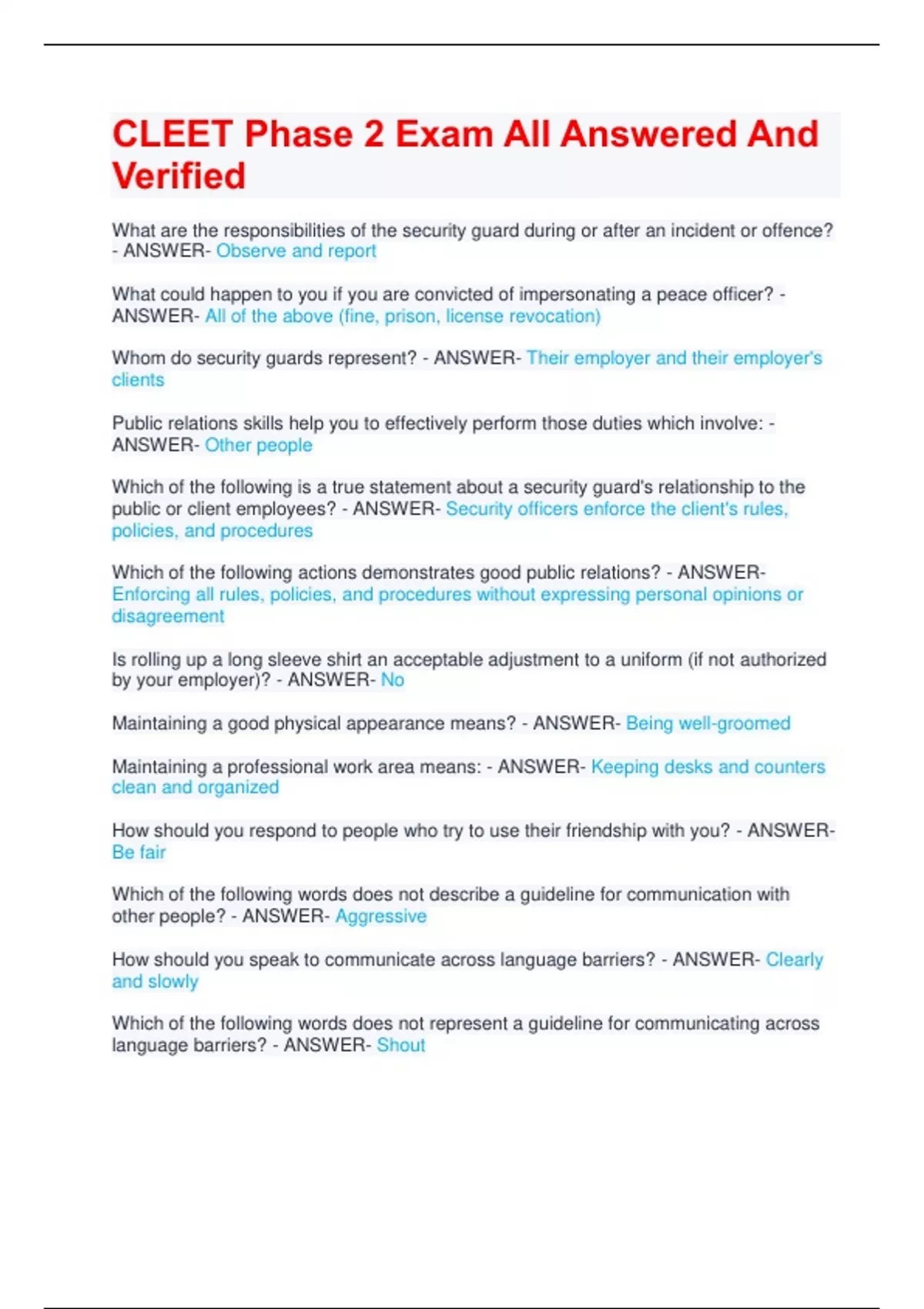 CLEET Phase 2 Exam All Answered And Verified What are the responsibilities of the security guard during or after an incident or offence? - ANSWER- Observe and report What could happen to you if you are convicted of impersonating a peace officer? - ANSWER- All of the above (fine, prison, license revocation) Whom do security guards represent? - ANSWER- Their employer and their employer's clients Public relations skills help you to effectively perform those duties which involve: - ANSWER- Other people Which of the following is a true statement about a security guard's relationship to the public or client employees? - ANSWER- Security officers enforce the client's rules, policies, and procedures Which of the following actions demonstrates good public relations? - ANSWEREnforcing all rules, policies, and procedures without expressing personal opinions or disagreement Is rolling up a long sleeve shirt an acceptable adjustment to a uniform (if not authorized by your employer)? - ANSWER- No Maintaining a good physical appearance means? - ANSWER- Being well-groomed Maintaining a professional work area means: - ANSWER- Keeping desks and counters clean and organized How should you respond to people who try to use their friendship with you? - ANSWERBe fair Which of the following words does not describe a guideline for communication with other people? - ANSWER- Aggressive How should you speak to communicate across language barriers? - ANSWER- Clearly and slowly Which of the following words does not represent a guideline for communicating across language barriers? - ANSWER- Shout How can you maintain your professionalism when communicating with the media? - ANSWER- Be pleasant at all times What is the proper response to answer questions from the media? - ANSWER- Refer media representatives to your supervisor