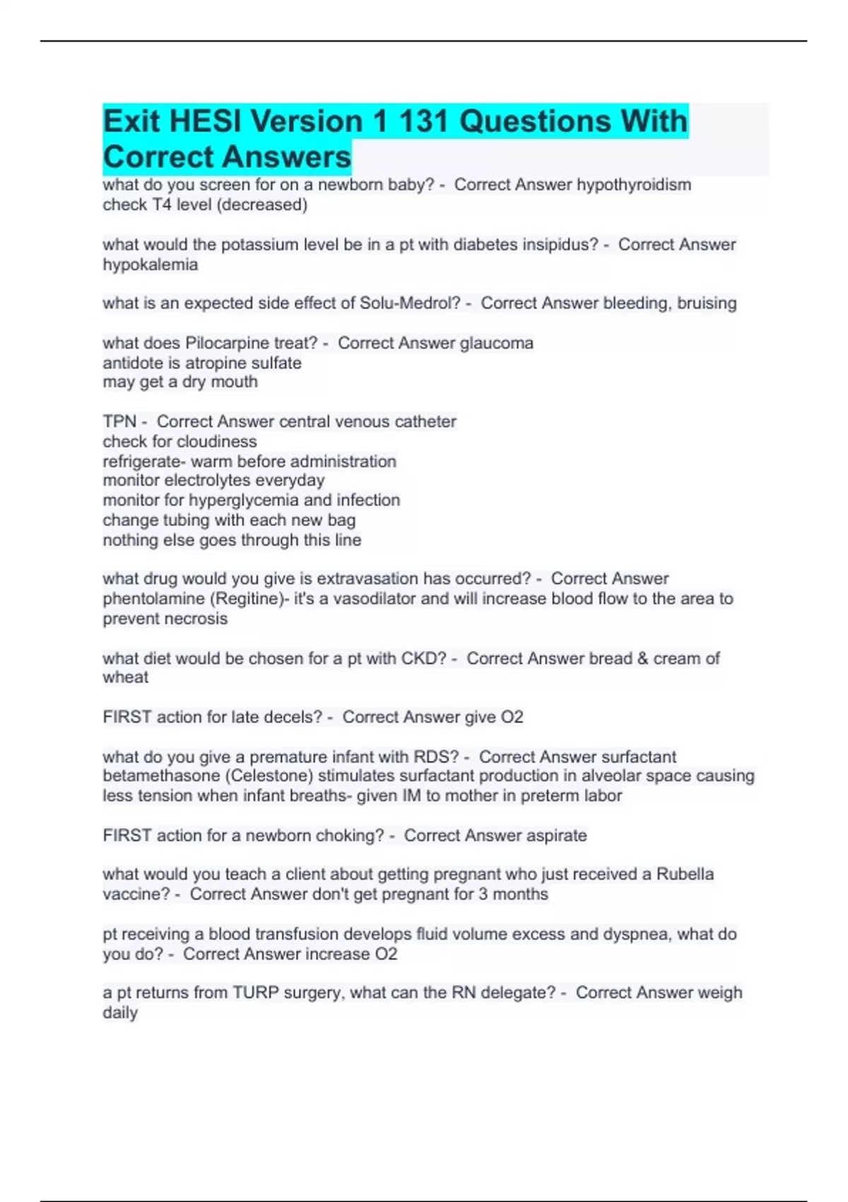 Exit HESI Version 1 131 Questions With Correct Answers what do you screen for on a newborn baby? - Correct Answer hypothyroidism check T4 level (decreased) what would the potassium level be in a pt with diabetes insipidus? - Correct Answer hypokalemia what is an expected side effect of Solu-Medrol? - Correct Answer bleeding, bruising what does Pilocarpine treat? - Correct Answer glaucoma antidote is atropine sulfate may get a dry mouth TPN - Correct Answer central venous catheter check for cloudiness refrigerate- warm before administration monitor electrolytes everyday monitor for hyperglycemia and infection change tubing with each new bag nothing else goes through this line what drug would you give is extravasation has occurred? - Correct Answer phentolamine (Regitine)- it's a vasodilator and will increase blood flow to the area to prevent necrosis what diet would be chosen for a pt with CKD? - Correct Answer bread & cream of wheat FIRST action for late decels? - Correct Answer give O2 what do you give a premature infant with RDS? - Correct Answer surfactant betamethasone (Celestone) stimulates surfactant production in alveolar space causing less tension when infant breaths- given IM to mother in preterm labor FIRST action for a newborn choking? - Correct Answer aspirate what would you teach a client about getting pregnant who just received a Rubella vaccine? - Correct Answer don't get pregnant for 3 months pt receiving a blood transfusion develops fluid volume excess and dyspnea, what do you do? - Correct Answer increase O2 a pt returns from TURP surgery, what can the RN delegate? - Correct Answer weigh daily I&O's- subtract irrigate from output kegal exercises for temporary incontinence what can be delegated to a nursing assistant or UAP? - Correct Answer can discontinue suction, but cannot turn back on grooming & hygiene feeding VS ROM I&O's obtain clean urine specimen transport client transfer from bed to chair; help with bed to stretcher help with turning and repositioning ambulate what can be delegated to a LPN? - Correct Answer PO meds and injections routine data collection, dressing change, catheter insertion, suctioning reinforce teaching; basic, simple teaching (turn, cough, deep breath) assist HCP in procedures when RN is unavailable (NGT insertion) can perform specific tasks in unstable situations what can the RN not delegate? - Correct Answer assessment, diagnose, analyze, plan, evaluate, teach, monitor receive and give report triage invasive lines sterile technique new admissions pre-op & post-op assessment what should you be monitoring in a client who has had a nephrectomy? - Correct Answer UOP it is more important than drainage what is important when caring for pt in skeletal traction? - Correct Answer pin care; sterile technique; remove crust; serous drainage is ok what do you do if the pins come out of someone with skeletal traction? - Correct Answer immobilize extremity do not re-insert how do you deal with a rude doctor that is avoided by the nurses? - Correct Answer staff meeting what are some diet recommendations for a client with anorexia who has become hypoglycemic? - Correct Answer simple sugars- milk, coke, juice, raisins once sugar is up, eat complex carbs & protein- PB and crackers low fat, high calorie, high protein what would you teach a pt taking disulfiram (Antabuse)? - Correct Answer must sign consent form stating they will avoid all alcohol many preparations contain alcohol- cough syrup, mouthwash, aftershave, cologne what is confrontation? - Correct Answer calling attention to inconsistent behaviors