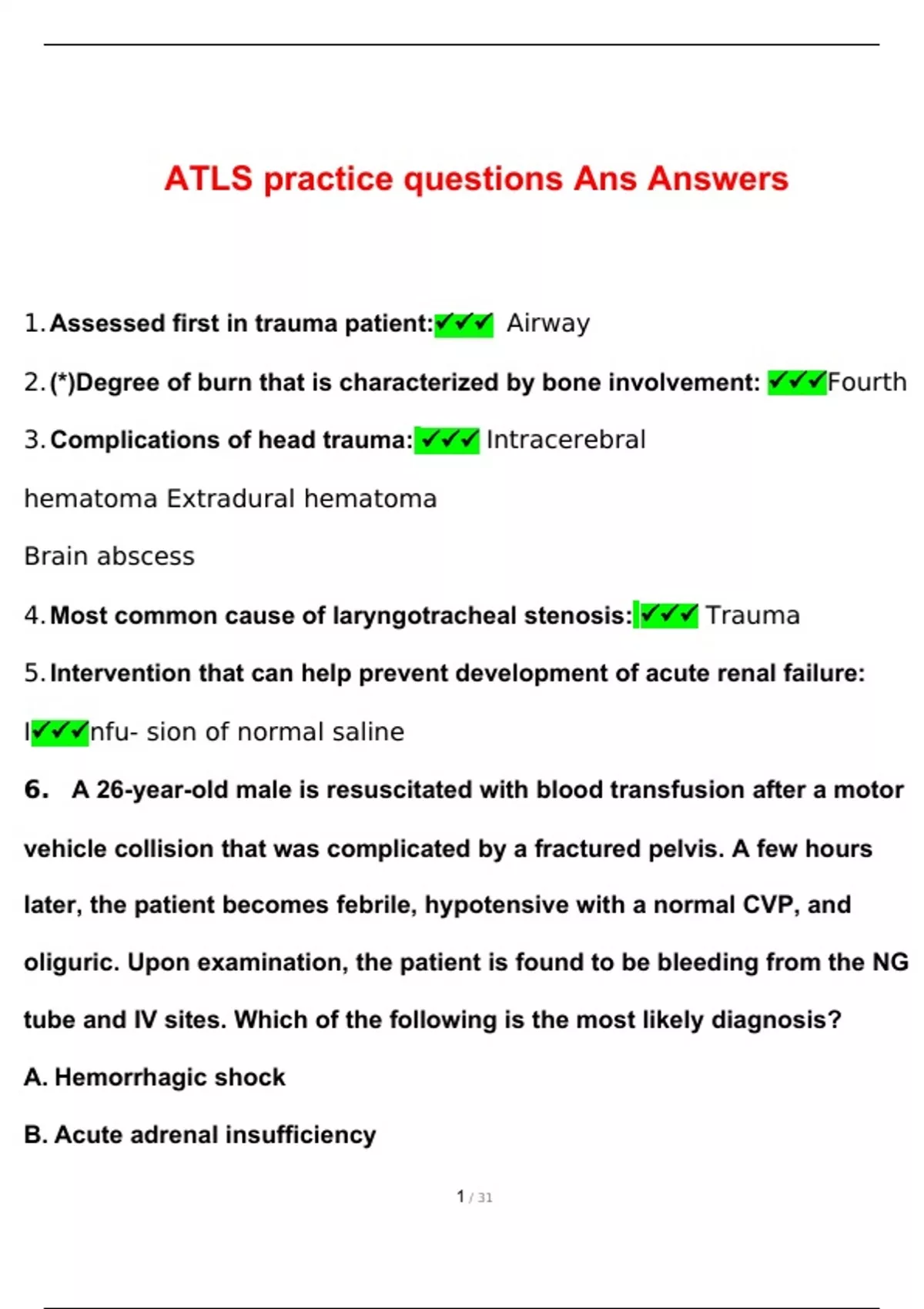 ATLS Exam Study Guide Questions with 100% Correct Answers | Latest Version 2024 | Verified